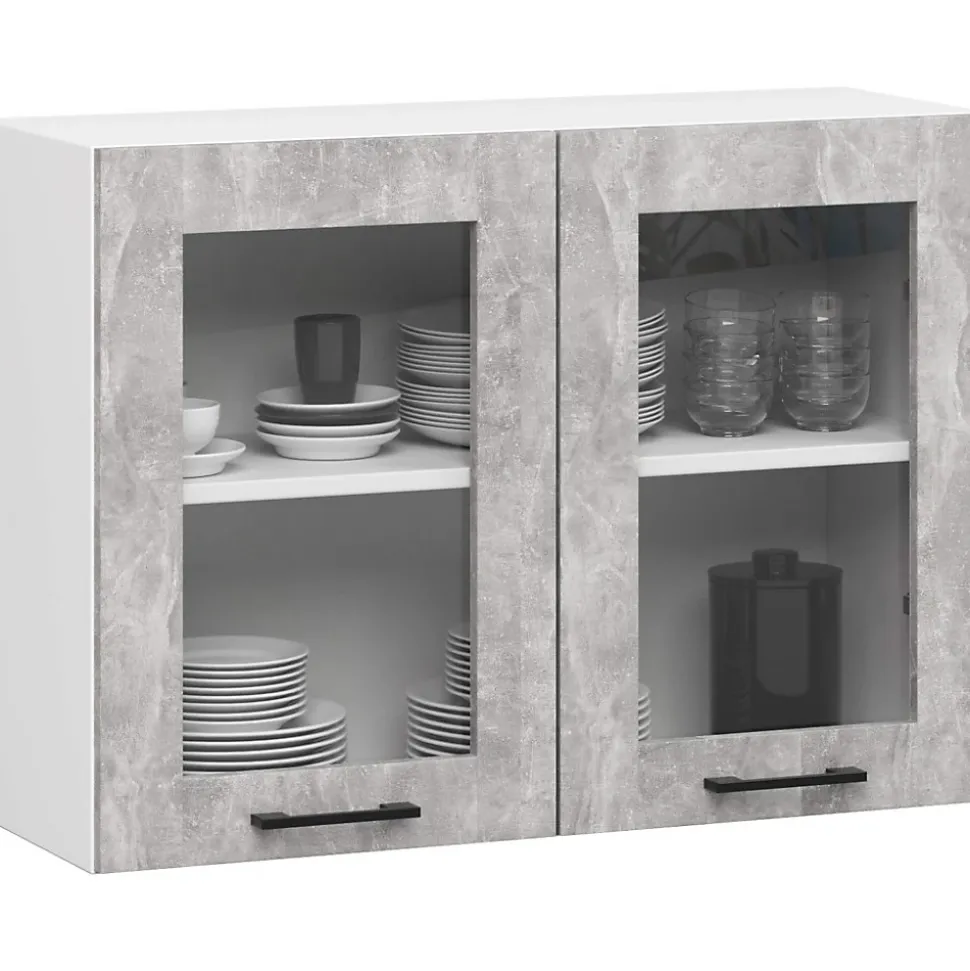 Ensemble de cuisine vitré AKORD OLIWIA 3.0m Blanc 300 cm 11 portes 1 tiroir façade Béton 300x46x203 cmL’ensemble d’angle OLIWIA avec vitrine 300 cm blanc / béton est un ensemble de meubles de cuisine destiné aux personnes qui ont besoin de beaucoup d’espace dans la cuisine. L’ensemble comprend : un meuble sur pied de 40 cm avec une porte et un tiroir, un meuble sous évier de 80 cm (deux portes) et un meuble d’angle de 90 cm. Parmi les meubles suspendus, on trouve : un meuble de 40 cm avec une porte et une étagère, un meuble sous évier de 60 cm, un meuble de 80 cm avec deux portes et une étagère, deux meubles de 30 cm, un meuble de 80 cm (deux portes et une étagère) et un meuble d’angle de 60 cm avec une étagère. Les meubles sur pied ont une profondeur de 46 cm, les meubles suspendus de 30 cm. La hauteur des meubles sur pied avec plan de travail est de 85 cm et celle des meubles suspendus de 58 cm. L’exception est le meuble de la hotte, qui mesure 30 cm de hauteur. Les couleurs de l’ensemble sont : corps blancs, façades en aspect béton et plan de travail en chêne Sonoma.Dimensions:Largeur: 300cmProfondeur: 46cmHauteur: 203 cmMatériel: Panneau stratifiéSpécifications:Couleur:Façades: BetonCorps de meuble: BlancFinition des façades: Finition mateMatériel: Panneau stratifiéNombre d’étagères: 16Nombre de portes: 11Porte: 11Nombre de tiroirs: 1Profondeur du tiroir: 43,5cmLargeur du tiroir: 31cmType de porte: Porte battantePoids: 167,7 kgNombre d’éléments dans l’ensemble: 9