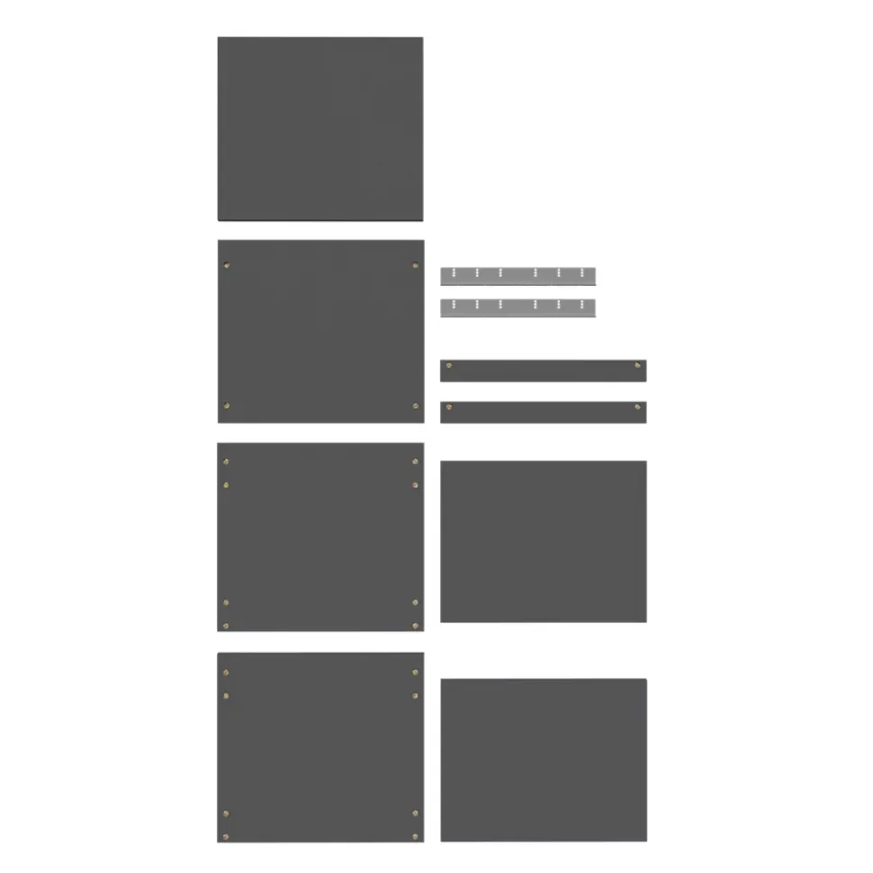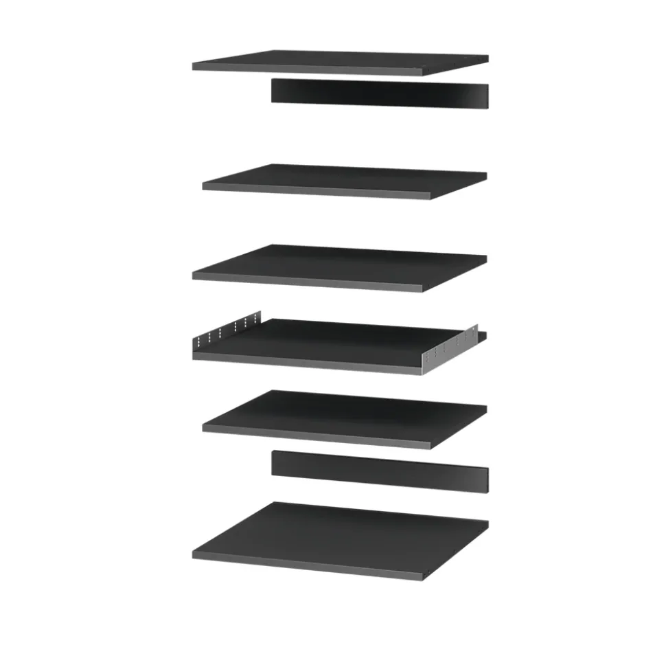 - Ce lot de tablettes est livré avec quatre tablettes réglables, une tablette fixe, quatre pieds, des taquets en métal, des fixations d’assemblage et une notice