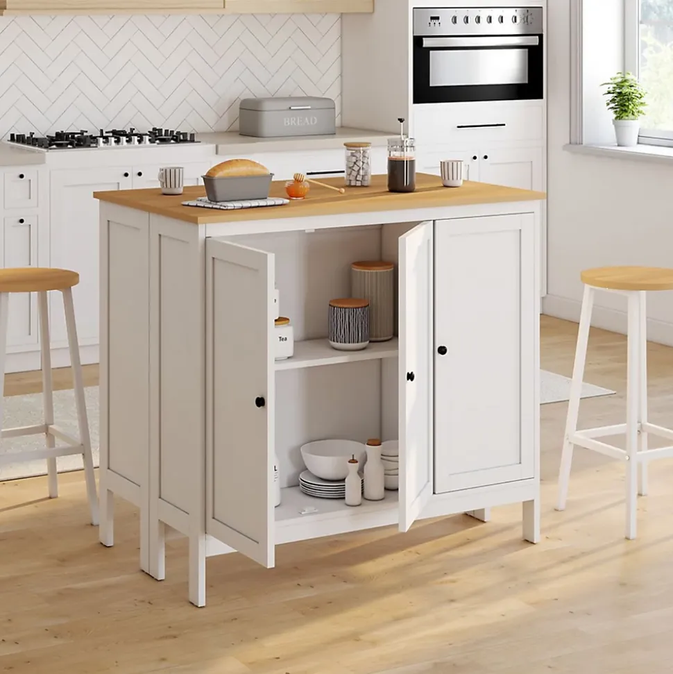 Optimisez et organisez l’espace de votre cuisine grâce à notre ensemble table de bar îlot ACHILLE avec plan de travail et rangements bois et blanc et nos tabourets ronds !Avec ses coloris intemporels et ses lignes sobres et épurées, le mange-debout ACHILLE se mariera avec tous les types d’intérieurs !Hyper pratiques, ses placards fermés avec étagères ajustables vous permettront de ranger élégamment vaisselle, petit électroménager ou encore provisions de nourriture, optimisant ainsi votre rangement avec discrétion !Tantôt coin repas, tantôt coin cuisine, avec sa triple fonction table haute de bar/plan de travail/meuble de rangement, cet îlot est à la fois pratique et stable grâce à sa structure robuste !Son format compact grâce à son plateau rabattable est idéal pour aménager les petits espaces comme les studios et être collé contre un mur ou venir délimiter deux espaces de vie avec style ! Glissez les tabourets de bar ronds sous le plateau pour un gain de place maximal !Avec leur design moderne, ses 2 tabourets de bar s’allieront à la perfection avec nôtre îlot pour donner une ambiance moderne et chic à votre intérieur !Conçus avec une structure en métal blanc, une assise en panneaux de particules de bois et équipés d’un repose pieds, les tabourets de bar ronds seront parfaits pour un usage quotidien : ils sont robustes, stables et ne craignent pas les taches.Optez sans tarder pour cette association tendance et conviviale à la fois fonctionnelle et décorative !Dimensions de l’ensemble table de bar îlot ACHILLE et 2 tabourets de bar rondsDimensions globales de l’îlot : Longueur 100 cm x largeur 60 cm x Hauteur 90 cmDimensions des portes : L.68 x H.31 cmDimensions intérieures doubles portes : L.63,5 cm l.21 x H.68 cm – 1 étagère ajustable sur 3 niveauxDimensions intérieure porte de droite : L.30,5 x l.21 x H.68 cm – 1 étagère ajustable sur 3 niveauxEncadrement : 5 cmHauteur des pieds : l.5 x H.15,50 cmMatériaux : panneaux de particules de boisColoris : bois façon hêtr