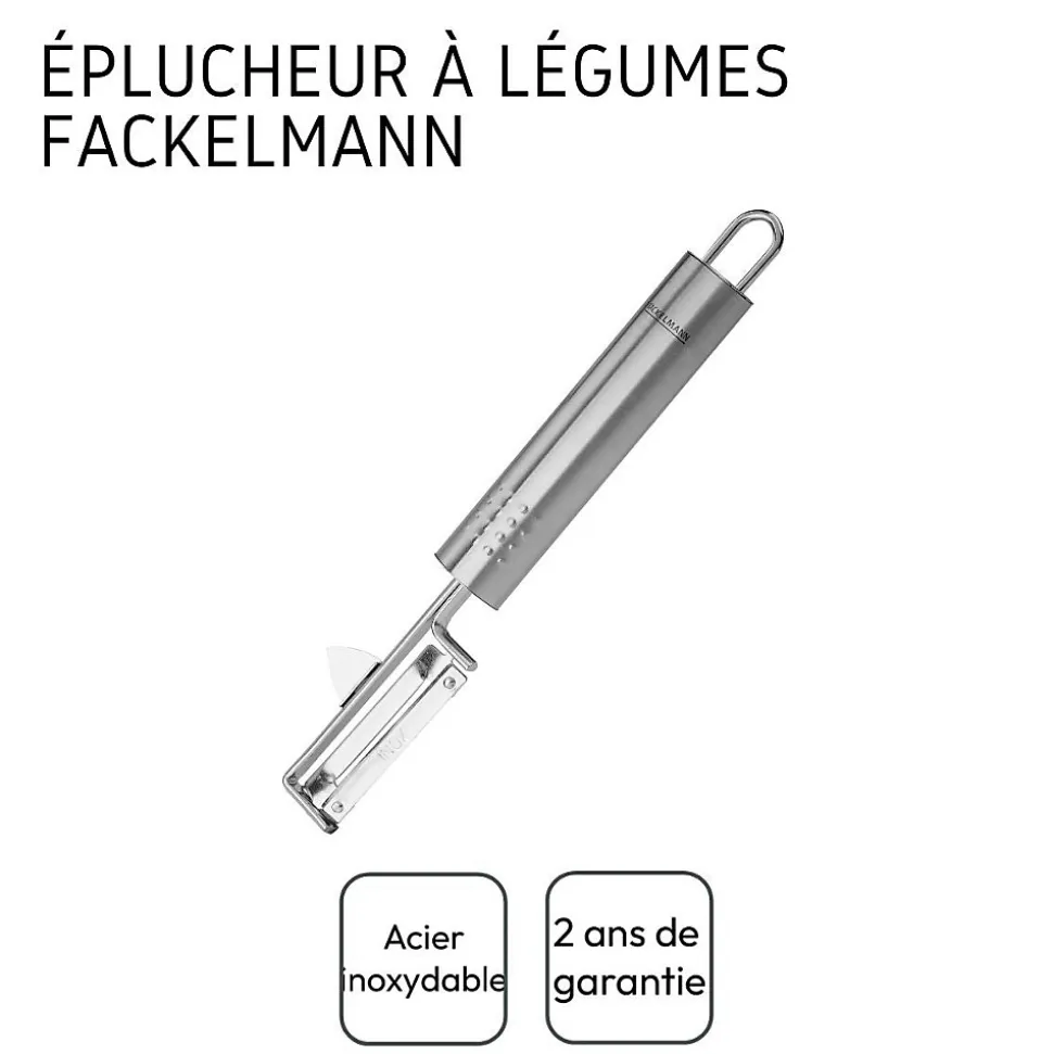 DECRIPTION : Eplucheur à légumes inox avec pointe pour enlever les imperfections des fruits et légumesLE PETIT + : Les fruits et les légumes sont excellents pour la santé alors pour en consommer assez, vous pouvez les cuire pour en faire des tartes. Les tartes aux légumes ou aux fruits sont faciles à faire avec cet éplucheurCOMPOSITION : Acier inoxdableDIMENSIONS : 19 x 3,5 cmCONTENU : 1 éplucheur de pomme de terreL’éplucheur à légumes de Fackelmann est entièrement fabriqué en acier inoxydable. Cet éplucheur permet de peler touts vos fruits et légumes. Il est utile à la fois pour enlever la peau des fruits et légumes et pour trancher les légumes en fines lamelles de type tagliatelles.L’éplucheur de pommes de terre est facile à manipuler grâce à son manche ovale.Fackelmann France est une entreprise spécialisée dans la distribution d’ustensiles de cuisine et de pâtisserie ainsi que de moules à gâteaux et de plaques de cuisson. L’entreprise tente d’apporter une certaine facilité dans la façon de cuisiner de chacun grâce à ses ustensiles malins.Les ustensiles de cuisine de Fackelmann France sont proposés à tous les profils de cuisiniers pour une utilisation simple et quotidienne. Les fouets, spatules, louches, éplucheurs, planches à découper et bien d’autres sont à votre portée afin de préparer de délicieuses recettes toujours plus originales.