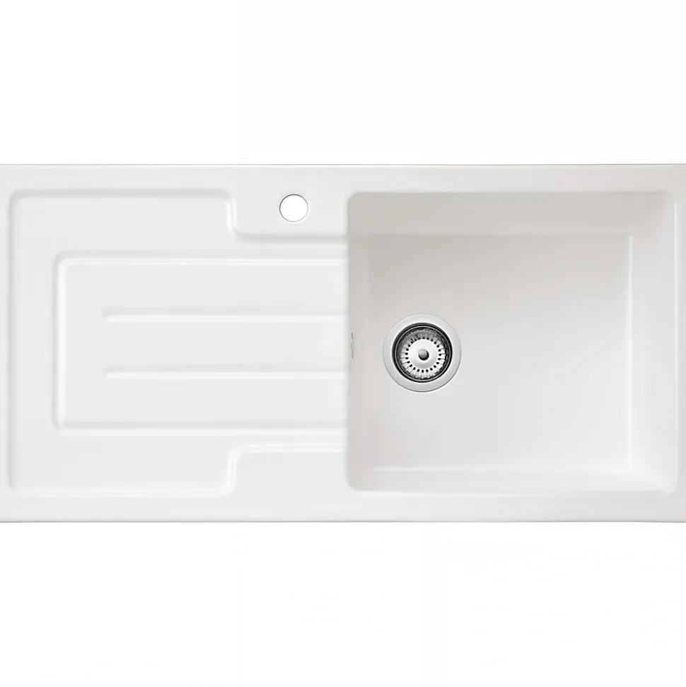 Évier Reno 1 cuve et égouttoir avec vidage. Série: Reno. Code: 7310V. Poids: 31.00. Longueur: 100. Largeur: 50. Matériel: Gres Fin. Couleur: Blanc. Contenu du paquet: Évier Reno réf. 7310 avec trop-plein rond et deux trous pré-esquissés, Vidage D90 réf. 473811. Siphon réf. 470100 non inclus. Variantes: 7310 sans vidage et avec deux trous pré-esquissés, 7310D cuve droite avec trou pour robinet, 7310DV cuve droite avec vidage et trou pour robinet, 7310E cuve gauche avec trou pour robinet, 7310EV cuve gauche avec vidage et trou pour robinet. Composants: Vidage pour évier 1 cuve Reno, Siphon pour évier 1 cuve Reno.