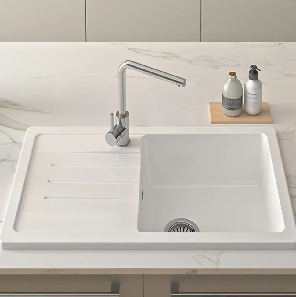 Évier Reno XS 1 cuve droite avec vidage, série Reno, code 7313V, matériau Gres Fin, blanc. Évier encastré sur le dessus de Fireclay avec trop-plein rond. Variantes disponibles avec 2 trous pré-percés et différentes positions de cuve. Accessoires inclus : vidage Ø90 Réf. 4738. Accessoires compatibles disponibles séparément.