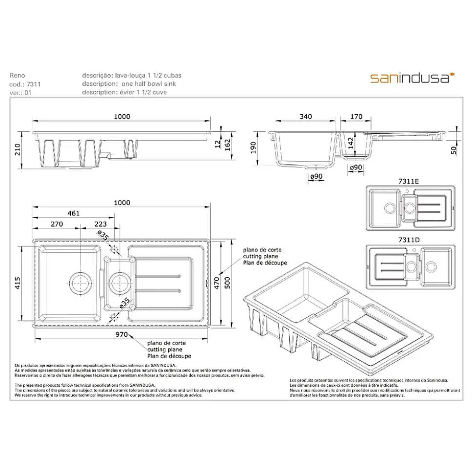 Évier Reno 1+1/2 cuve blanc, référence 731100V, EAN 5604815328493, marque SANINDUSA. Nom complet : Évier Reno 1 cuve et 1/2 avec égouttoir et vidage, série Reno, code 7311V. Dimensions : longueur 100, largeur 50, poids 33.00, matériau Gres Fin, blanc. Contenu du paquet : évier Reno réf. 7311, sans trop-plein, avec deux trous pré-esquissés, vidage D90 réf. 470311. Variantes disponibles. Composants et produits compatibles disponibles. Accessoires non inclus.