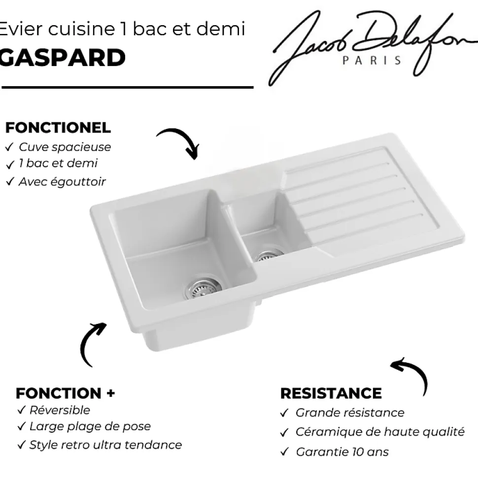 Avantages de votre évierÉvier fonctionnelÉgouttoir pratiqueÉvier réversibleMatériau durable : céramique résistanteEvier garantie de 10 ansInstallation aisée : conçu pour être encastré sur un plan de travail, cet évier s’intègre facilement dans un meuble sous-évier d’au moins 60 cm de largeur.Caractéristiques techniques votre évier Dimensions : 100 x 50 cmPoids : 29,5 kgMatériau : CéramiqueType d’installation : Encastré par-dessusPré-perçage robinetterie : 2 trous pré-percésTrop-plein : Non inclusNombre de vasques : 1,5 cuvesConvient pour un meuble de 60 cm de largeur minimumPoints forts du Robinet cuisine RaphaëlDesign moderne et élégantGrande hauteur sous becBras souple en siliconeBec rotatif à 360°Mitigeur pratique : doté d’un bras pivotantDouchette à trois jetsCaractéristiques techniques du robinetDimensions : 12,70 x 21,50 cmType d’Installation : 1 trouTypeDébit : 7 l/mnHauteur Totale : 448 mmSaillie du Bec : 230 mmRaccords : Avec flexibles d’alimentationMécanisme : Cartouche à disques céramiqueGarantie Mécanisme : 5 ansGarantie Finition : 10 ansEntretien Facile : Aérateur anti-calcaireMaintien Précis : Douchette avec fixation magnétiqueFonctionnalités Pratiques : Douchette 3 fonctions (jet classique, jet concentré, pause)Confort d’Utilisation : Bras souple pivotant à 360°Économie d’Ea: Débit limité à 7 l/mn