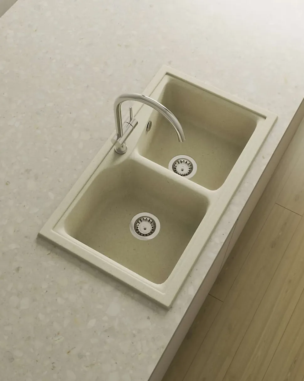 Evier à installation sur plan (à encastrer) avec deux cuvesRésistance aux rayures, à l’abrasion, à la chaleur (185°C), aux agents chimiques et aux colorants selon les tests UNE-EN 13310 -> Sans altérationLivré avec bonde manuelle ronde, siphon, colle mastic et barre de soutien.