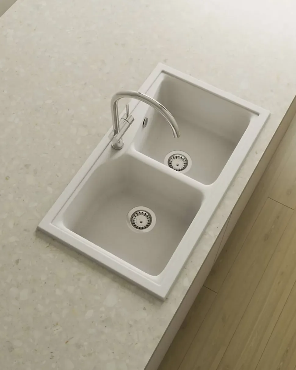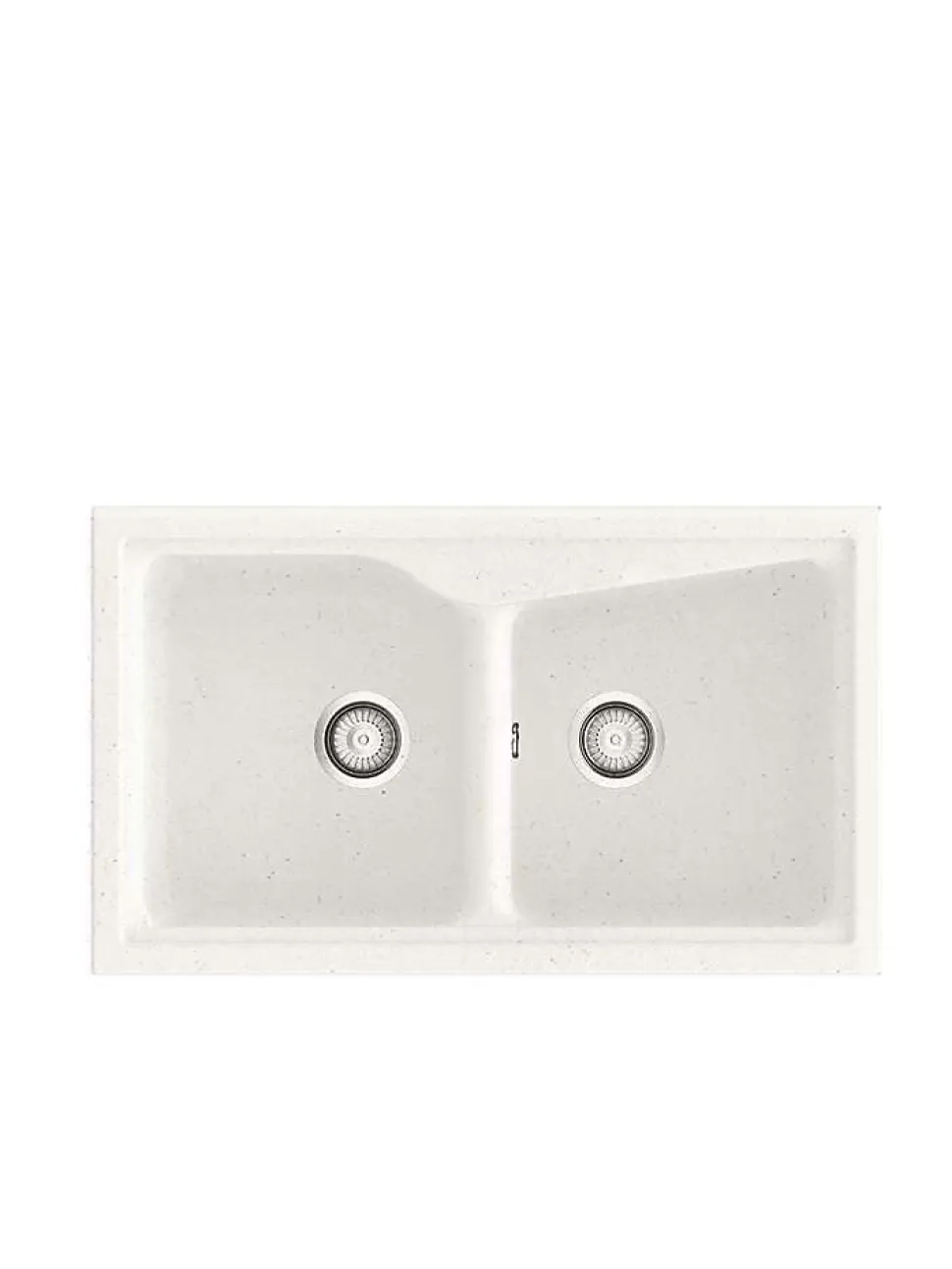 Evier à installation sur plan (à encastrer) avec deux cuvesRésistance aux rayures, à l’abrasion, à la chaleur (185°C), aux agents chimiques et aux colorants selon les tests UNE-EN 13310 -> Sans altérationLivré avec bonde manuelle ronde, siphon, colle mastic et barre de soutien.