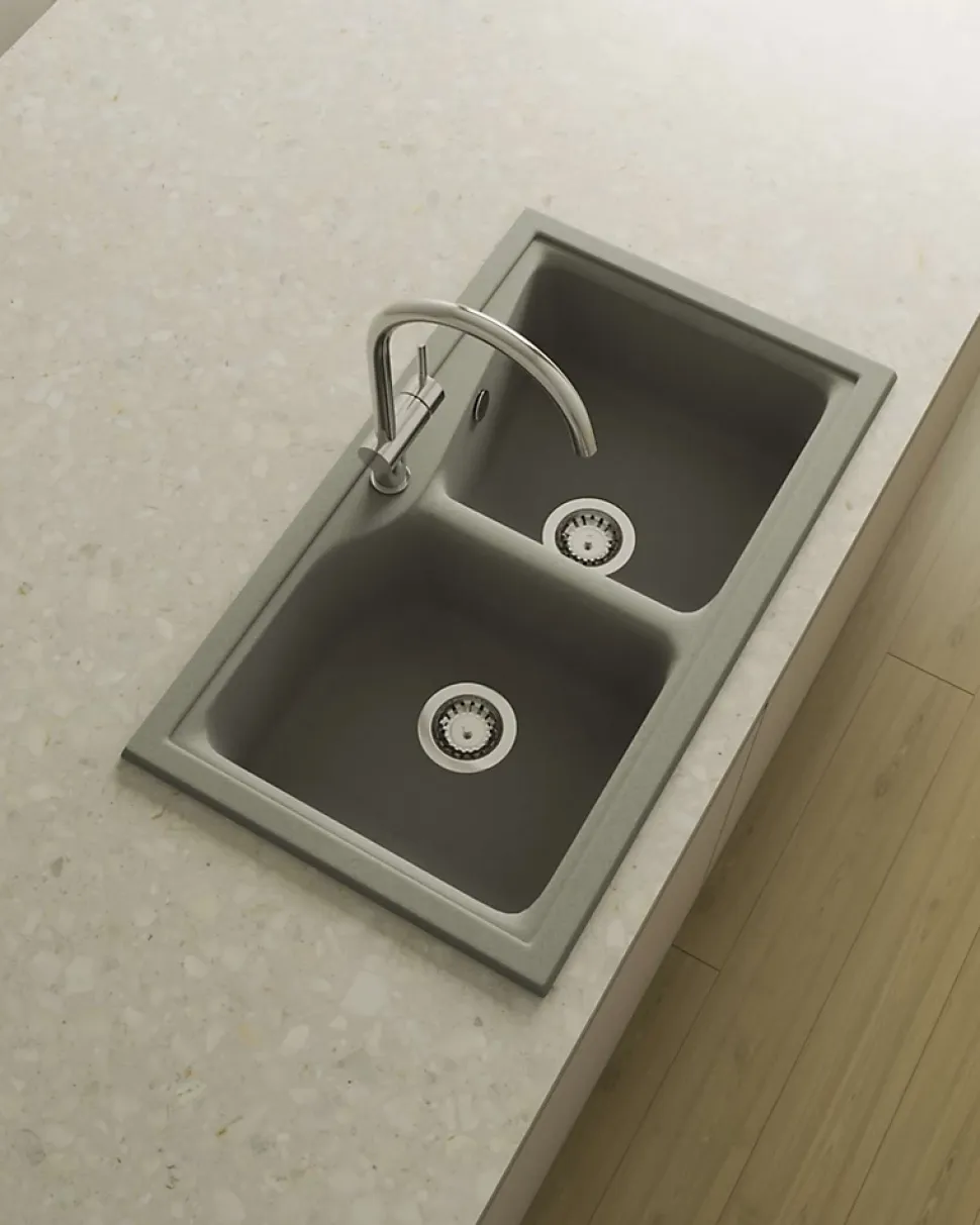 Evier à installation sur plan (à encastrer) avec deux cuvesRésistance aux rayures, à l’abrasion, à la chaleur (185°C), aux agents chimiques et aux colorants selon les tests UNE-EN 13310 -> Sans altérationLivré avec bonde manuelle ronde, siphon, colle mastic et barre de soutien.