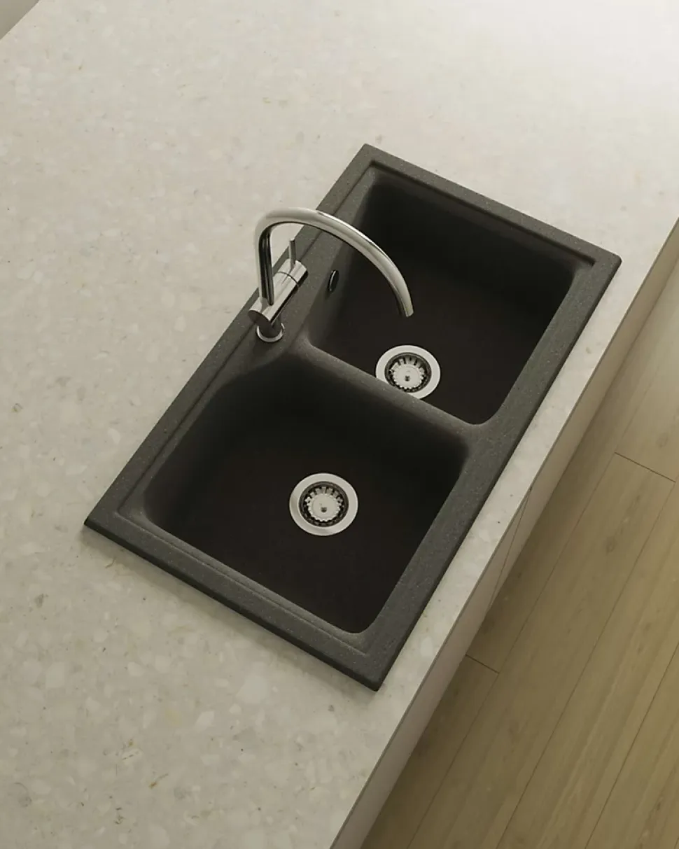 Evier à installation sur plan (à encastrer) avec deux cuvesRésistance aux rayures, à l’abrasion, à la chaleur (185°C), aux agents chimiques et aux colorants selon les tests UNE-EN 13310 -> Sans altérationLivré avec bonde manuelle ronde, siphon, colle mastic et barre de soutien.