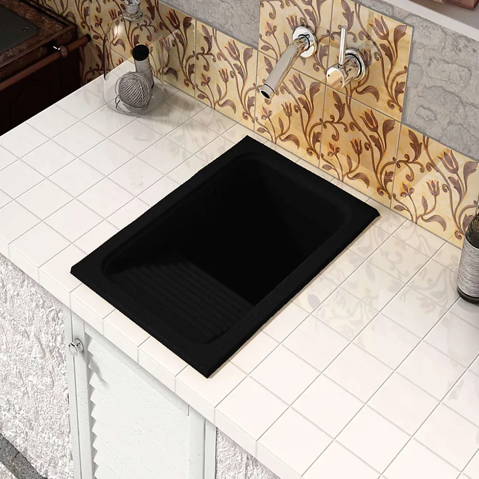Evier ou bac à laver à installation sur plan (à encastrer) avec une cuve et un égouttoirIdéal pour buanderie, cellier ou arrière-cuisineInclus : une bonde ronde.Résistance à l’impact : 12 kgf/m2Résistance à la compression : 1595 kgf/m2Résistance à la flexion : 5110 MPARésistance thermique : 130 oCDureté Barcol (935) : 45Résistance aux tâchesAvec des détergents : Pas de changementAvec des produits anticalcaires : Pas de changement