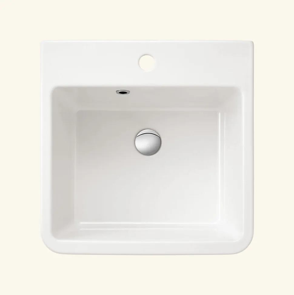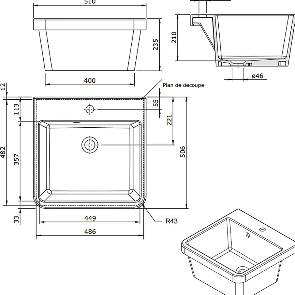 POINTS FORTS : • Évier encastrable 51×50 cm • • Meuble sous évier 60 cm minimum• • Evier vidage manuel • • Rebords épais CARACTÉRISTIQUES : • Équipements inclus : bonde(s), trop plein, tuyaux d’évacuation • Marque : Sanindusa • Matériau : Céramique • Type de pose : à encastrer • Positionnement égouttoir : sans égouttoir • Coloris : Blanc • Emplacement robinetterie : percé • Nombre de bacs : 1 bac • Poids net (Kg) : 17.1 • Trop plein : oui • Sous-meuble : 60 cm • Longueur (mm) : 510 • Largeur (mm) : 506 • Longueur d’encastrement (mm) : 486 • Largeur d’encastrement (mm) : 482 • Grande dimension cuve 1 (mm) : 449 • Petite dimension cuve 1 (mm) : 357 • Profondeur cuve 1 (mm) : 210 • Diamètre bonde cuve 1 (mm) : 46 • Grande dimension cuve 2 (mm) : non disponible • Petite dimension cuve 2 (mm) : non disponible • Profondeur cuve 2 (mm) : non disponible • Diamètre bonde cuve 2 (mm) : non disponible • Bon à savoir : Convient davantage à une buanderie qu’à une cuisine. Livré sans siphon. • Vidage : manuel • Référence vidage : le vidage est déjà inclus