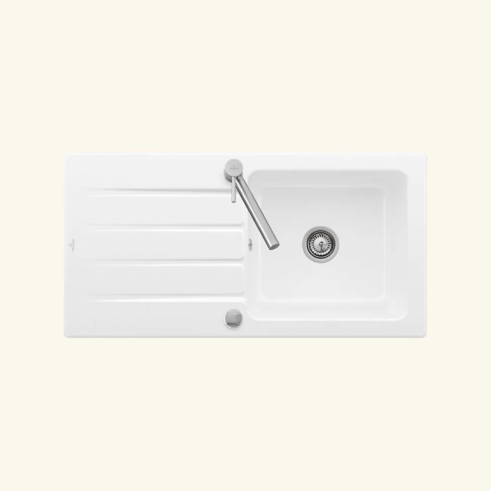 POINTS FORTS : CARACTÉRISTIQUES : • Équipements inclus : bonde(s), siphon, trop plein, tuyaux d’évacuation • Marque : Villeroy & Boch • Matériau : Céramique • Type de pose : à encastrer • Positionnement égouttoir : réversible • Coloris : Blanc • Emplacement robinetterie : percé • Nombre de bacs : 1 bac • Poids net (Kg) : 25.3 • Trop plein : oui • Sous-meuble : 60 cm • Longueur (mm) : 1000 • Largeur (mm) : 510 • Longueur d’encastrement (mm) : 970 • Largeur d’encastrement (mm) : 480 • Grande dimension cuve 1 (mm) : 440 • Petite dimension cuve 1 (mm) : 405 • Profondeur cuve 1 (mm) : 220 • Diamètre bonde cuve 1 (mm) : 90 • Grande dimension cuve 2 (mm) : non disponible • Petite dimension cuve 2 (mm) : non disponible • Profondeur cuve 2 (mm) : non disponible • Diamètre bonde cuve 2 (mm) : non disponible • Bon à savoir : ce produit ne présente pas de spécificités supplémentaires • Vidage : automatique • Référence vidage : le vidage est déjà inclus