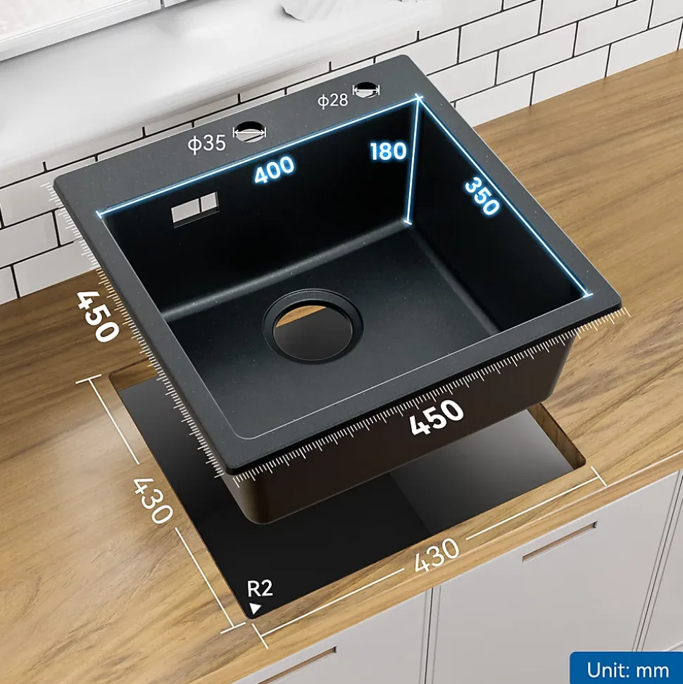 Cet évier de cuisine en quartz (80% quartz + 20% résine) allie élégance, robustesse et fonctionnalité. Avec ses dimensions compactes (45×45×20 cm) et son installation sur plan, il s’intègre parfaitement dans les petites et moyennes cuisines. Sa structure dense et non poreuse, fabriquée sous haute pression, résiste aux chocs, aux températures élevées et aux taches, tout en restant facile à nettoyer. Certifié TUV pour le contact alimentaire, il garantit une hygiène irréprochable. Doté d’un design à angles R2, d’une pente intégrée et d’un trop-plein, il maximise la capacité utile et simplifie l’entretien. Le système de drainage anti-odeurs et la sortie supplémentaire pour lave-vaisselle en font un choix pratique et durable.