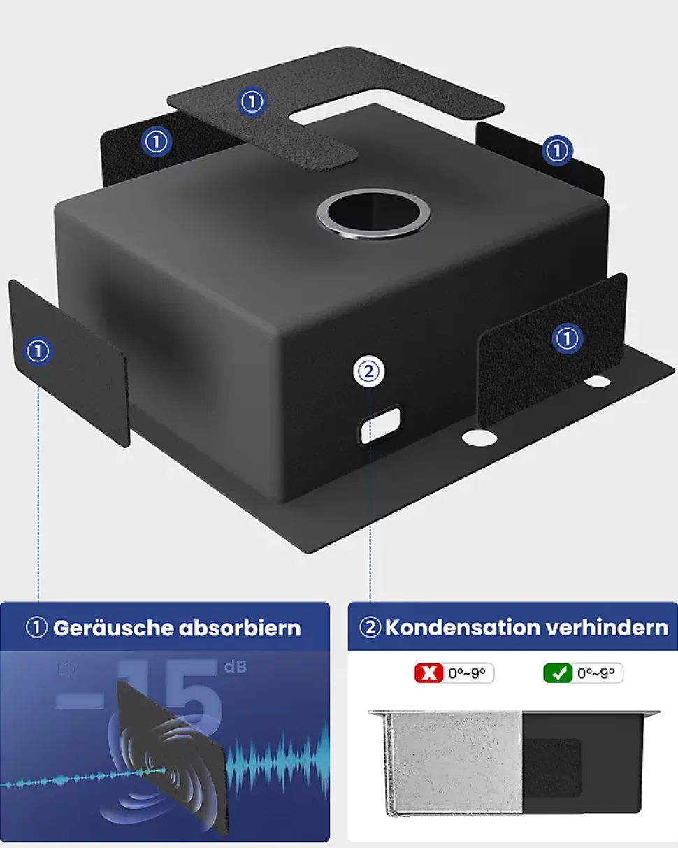 - & Réduction du bruit et anti-condensation : Tapis insonorisants sur 5 surfaces pour limiter les vibrations et bruits d’éclaboussures.Revêtement anti-condensation couvrant 95% de la surface, évitant la formation de gouttes et protégeant les meubles.