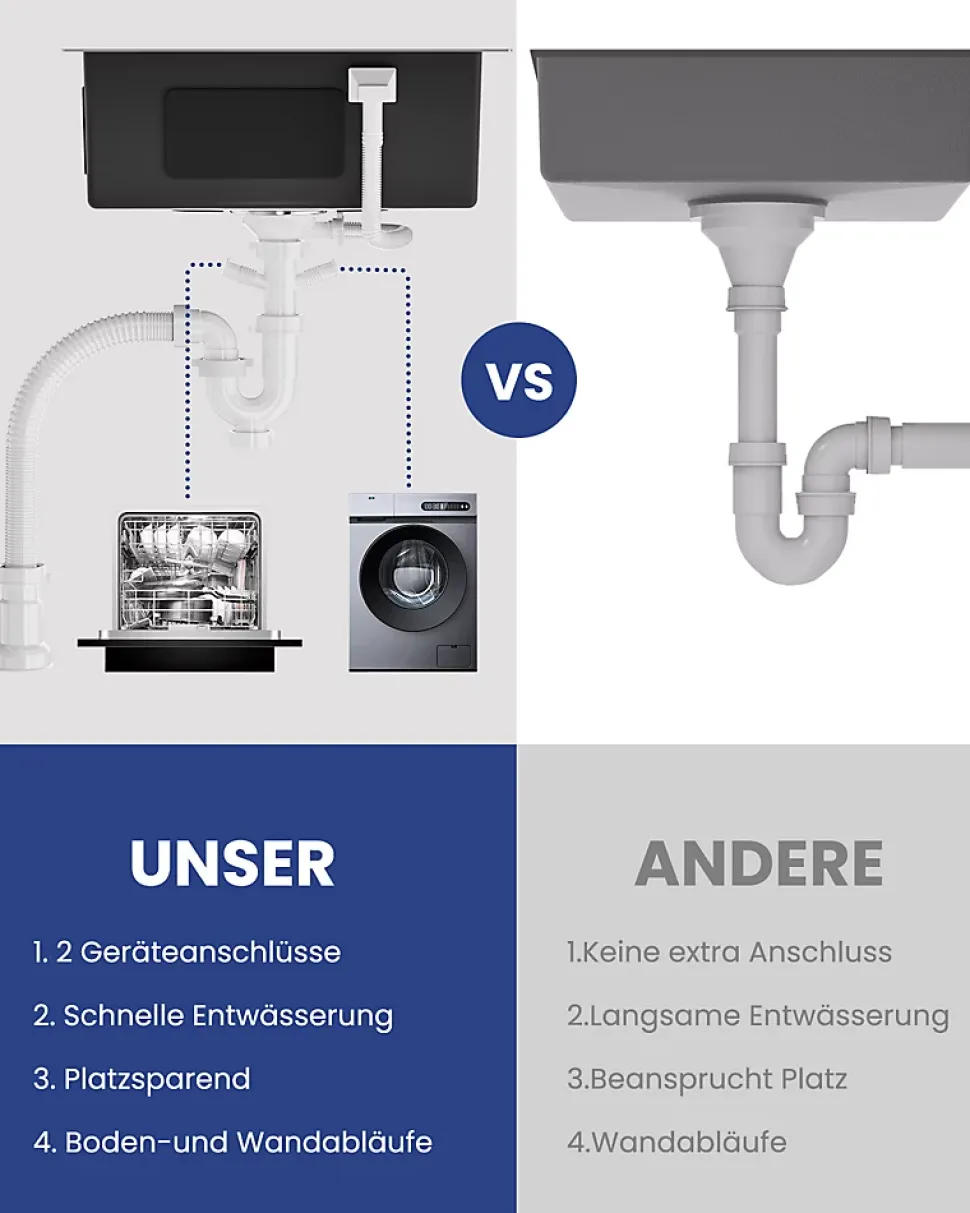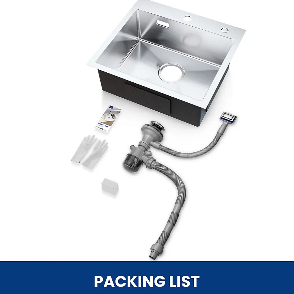 - & Kit complet : Inclut évier, siphon, dispositif de trop-plein, gabarit de découpe, gants et manuel d’installation. Compatible avec nos robinets et distributeurs de savon pour une harmonie esthétique.