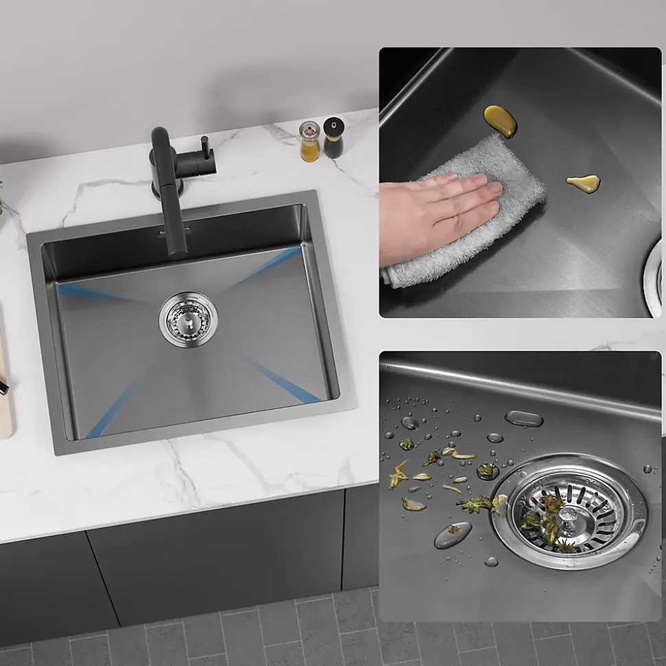 Ce bac de cuisine en acier inoxydable 304 (fini brossé) allie durabilité, fonctionnalité et élégance. Avec ses dimensions généreuses (55×44×19 cm, bac intérieur : 50×39×18 cm), il offre une grande capacité et s’installe facilement en pose dessus, encastrée ou sous plan (recommandée), adapté aux meubles de 60 cm minimum. Son design intelligent inclut un angle R optimisé pour un nettoyage facile, un système anti-débordement discret, une bonde orientable à 360° et un siphon anti-odeurs avec raccords supplémentaires pour lave-vaisselle. La structure renforcée (3 mm d’épaisseur, fond anti-condensation et isolation EVA) assure silence, résistance aux chocs et une hygiène parfaite grâce à son écoulement rapide et sa surface anti-traces.