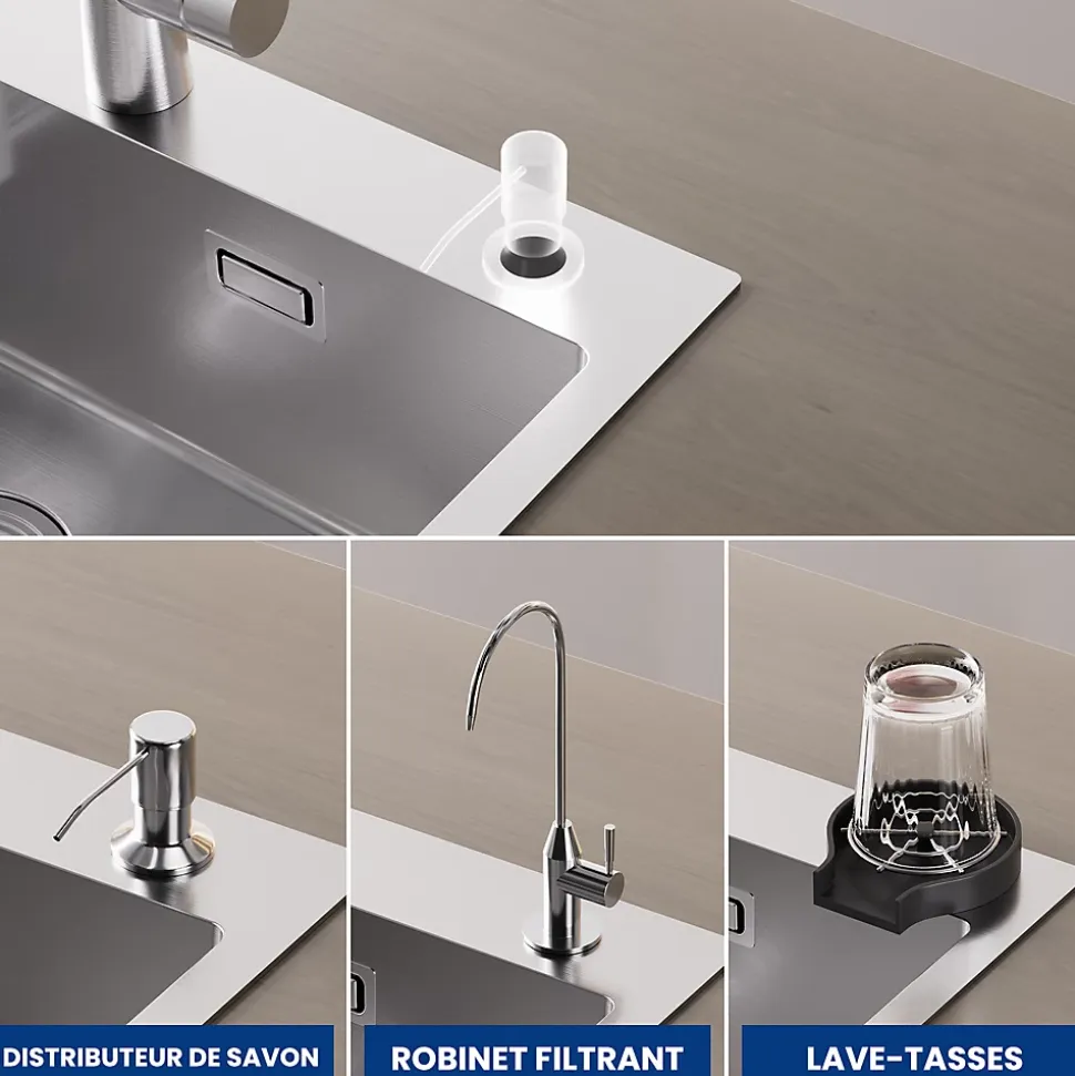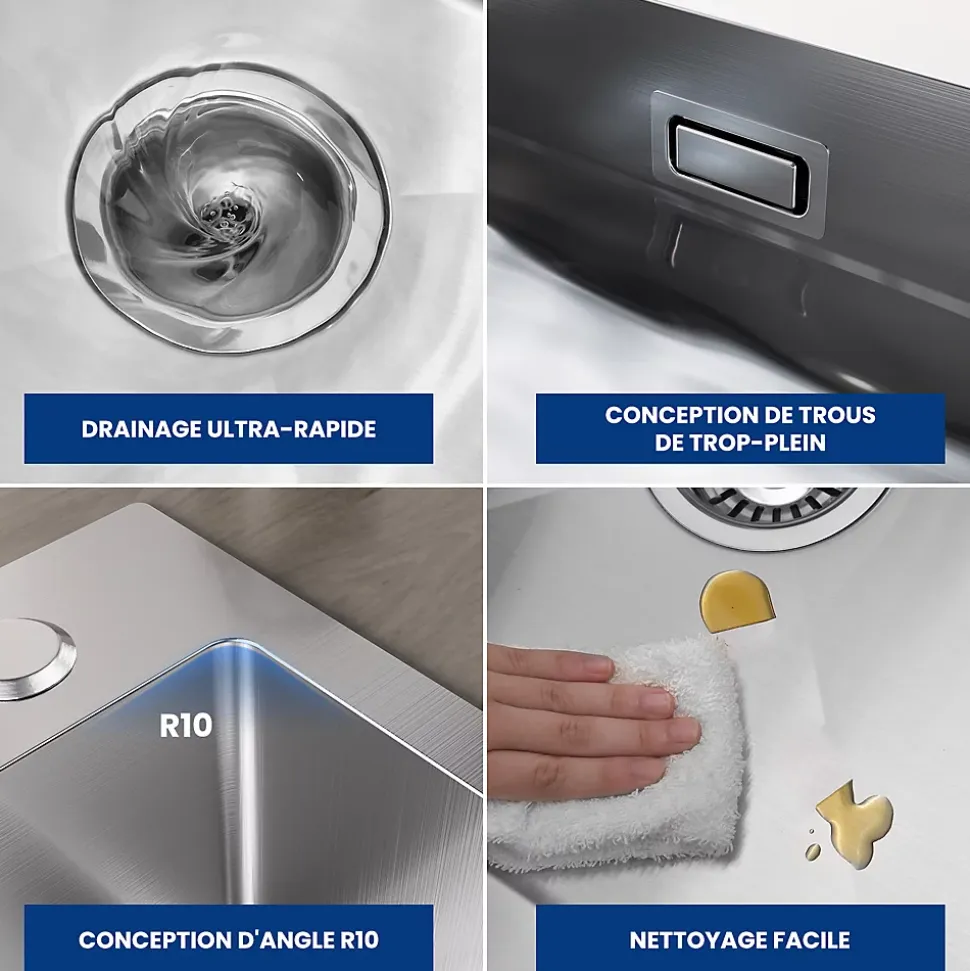 - ✔ Drainage efficace : Système de filtration en inox et tuyau en V anti-obstruction pour une évacuation rapide et sans odeurs.