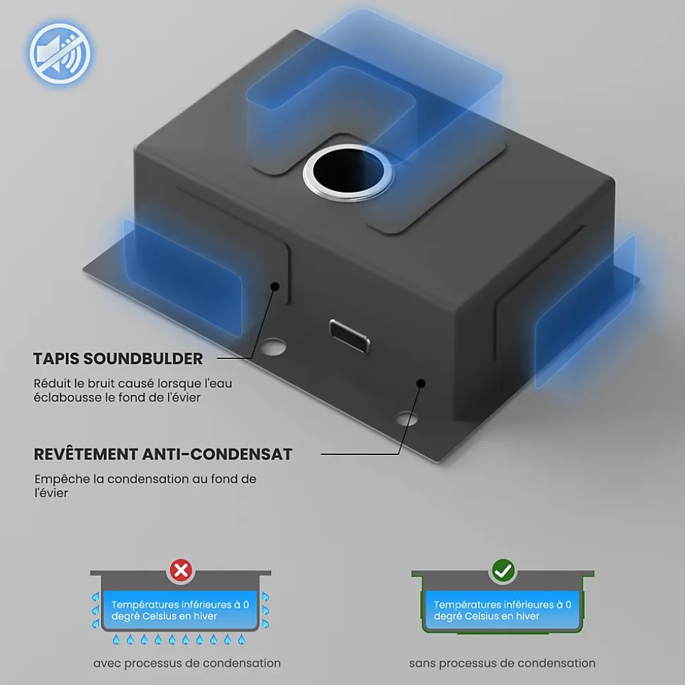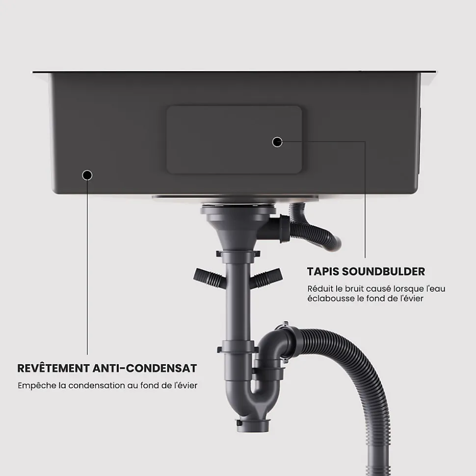 - ✔ Confort silencieux : Isolation EVA et couche anti-condensation pour réduire le bruit de l’eau et éviter les gouttes sous l’évier.