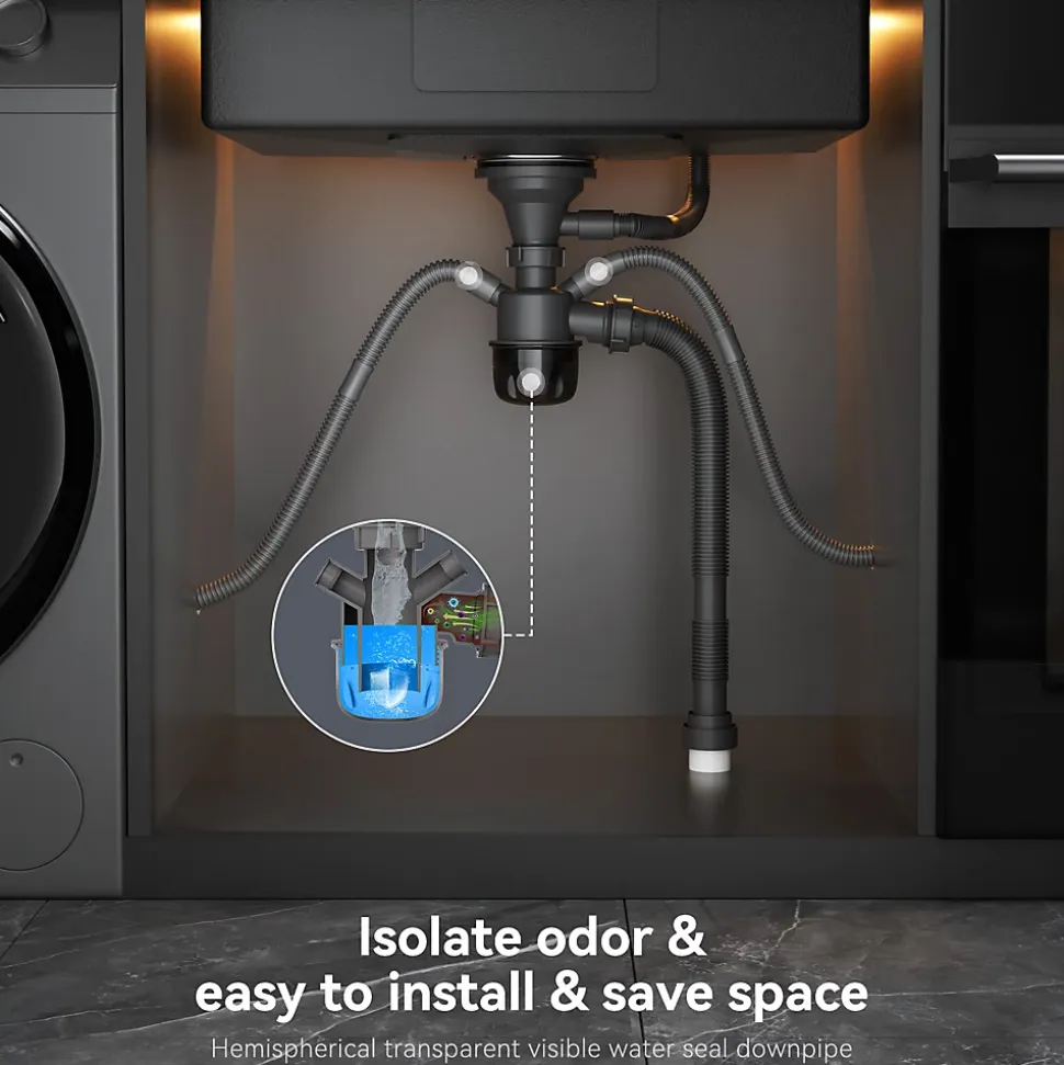 - ✔ Évacuation orientable et multifonction : Tube d’évacuation adjustable à 360° avec deux raccords prêts à l’emploi pour lave-vaisselle et autres appareils.