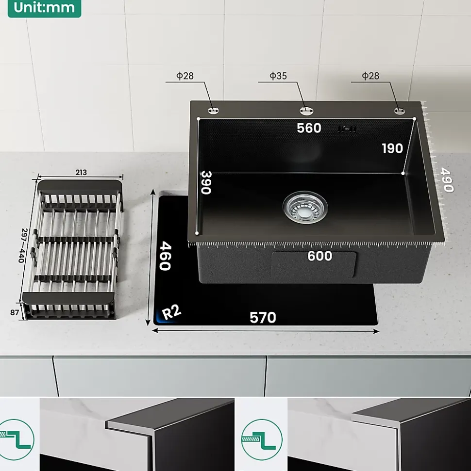 - & Kit complet : Inclut évier, Distributeur de savon, Panier égouttoir, siphon, dispositif de trop-plein, gabarit de découpe, gants et manuel d’installation. Compatible avec nos robinets et distributeurs de savon pour une harmonie esthétique.