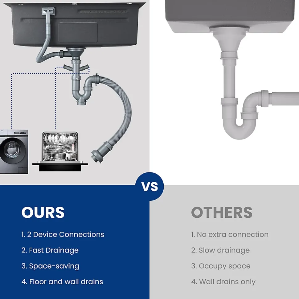 - ✔ Drainage optimiséÉvacuation en X anti-eau stagnante + siphon anti-odeurs avec 2 raccords pour lave-vaisselle.