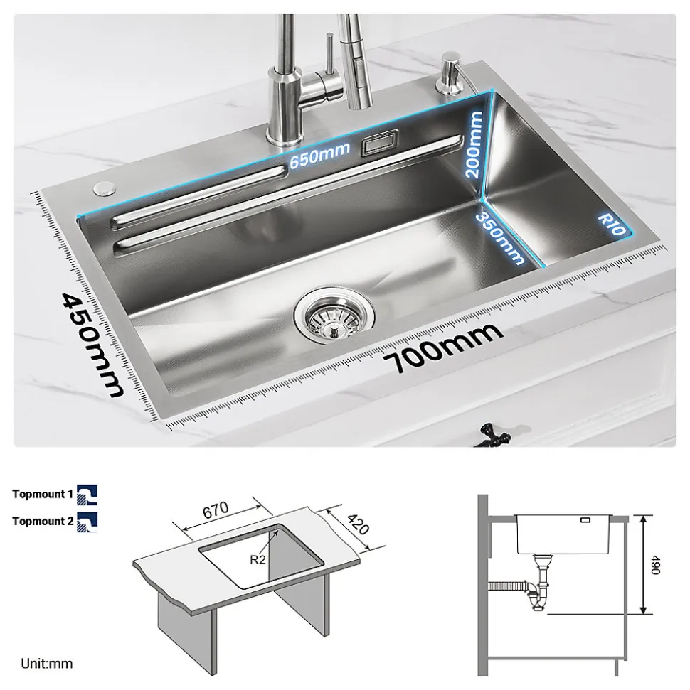 Description Générale du ProduitDécouvrez notre évier de cuisine multifonction en acier inoxydable 201 traité avec une technologie nano antiadhésive, offrant une résistance exceptionnelle aux rayures, à la corrosion et aux taches. Fabriqué artisanalement avec une soudure laser, il présente une épaisseur de 3 mm pour le panneau et 0,7 mm pour la cuve, garantissant une durabilité optimale.Avec ses dimensions de 70×45×21,5 cm, cet évier s’adapte parfaitement aux meubles de 80 cm et plus. Son design à double niveau inclut une plaque de décongélation en inox et un panier amovible, transformant un simple évier en espace de travail polyvalent (décongélation, égouttage, préparation). Le système de drainage en X évite l’accumulation d’eau, tandis que les angles R arrondis facilitent le nettoyage.