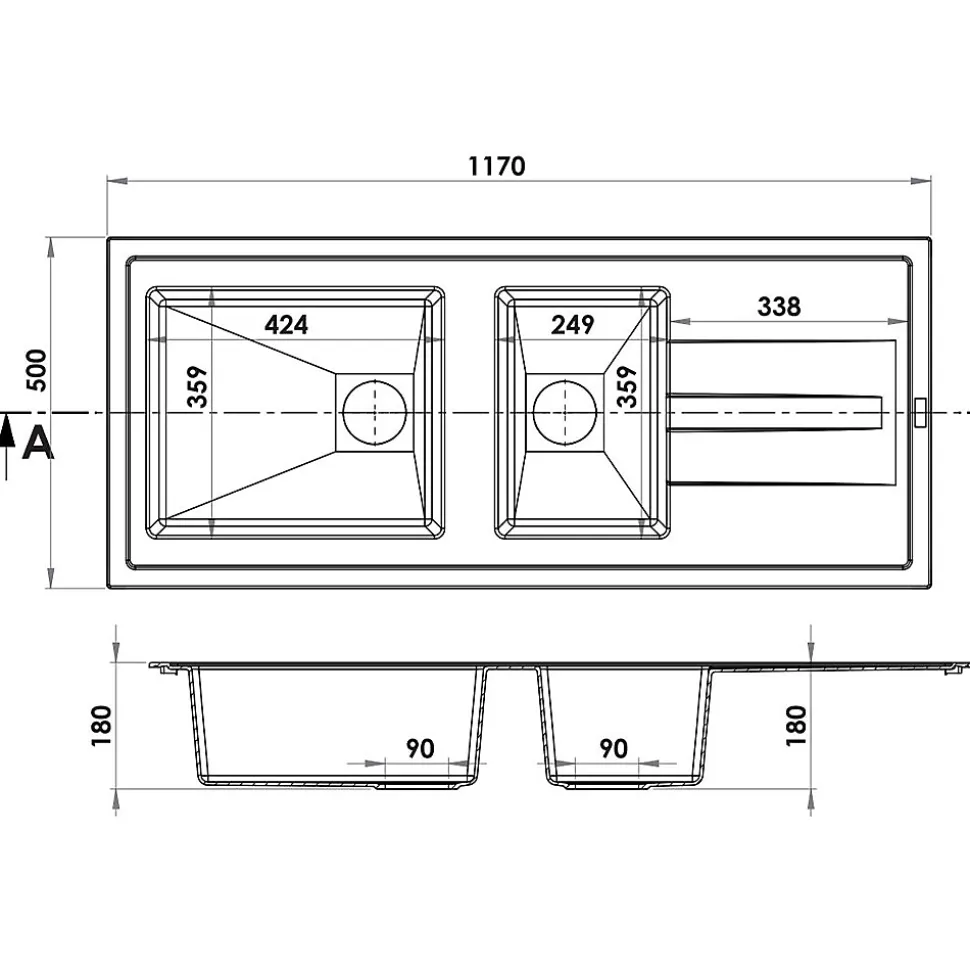 Evier de cuisine réversible à encastrer 2 cuves et 1 égouttoir, doté d’un système de vidage automatiqueFABRICATION FRANÇAISEÉvier encastrable en matériau minéral composite.Ce matériau minéral à 95 % est spécialement utilisé pour ses excellentes propriétés physiques et qui confère à l’évier une résistance aux chocs et rayures.Le composite minéral est aussi réputé pour ses qualités de résistance aux températures extrêmes (-40 C et +300 C)caractéristiques de l’évier de cuisine 2 bacs :Matière : résine minérale compositeColoris : blanc très légerement mouchetéNombre de cuves : 2Egouttoir : ouiRéversible : ouiType de vidage : AutomatiqueTrou de perçage vidage : oui (diamètre 90 mm)Trou de perçage robinetterie : oui (entraxe 35 mm)Dimensions de l’évier : 117 x 50 x 18 cm (Longueur X Largeur X Hauteur)Dimensions de la première cuve : 35,9 x 42,4 x 18 cmDimensions de la deuxième cuve : 35,9 x 24,9 x 18 cmS’encastre dans un meuble à partir de 80 cmPlan de découpe : 114 x 47,5 cmPoids : 10,5 KgLivré avec : notice de pose, schéma de découpe, système de vidage automatique, siphon et 8 équerres de fixationRésiste à des températures comprises entre -40 C et +300 C. Résiste aux chocs et rayures. Résiste aux produits d’entretien. Attention, la robinetterie n’est pas comprise. >Les plus de cet évier de cuisine blanc 2 bacs:Cet évier à encastrer est fabriqué en résine minérale composite, gage de résistance aux chocs et rayures et d’un entretien facile.Teinté dans la masse d’une épaisseur de 5 mm, il conservera longtemps son aspect d’origine.La combinaison de l’épaisseur et du matériau composite confère à cet évier de cuisine de bonnes qualités d’isolation phonique et thermique.Cet évier réversible pourra s’installer de la manière qui conviendra le mieux à vos besoins ou encombrement (égouttoir à gauche ou à droite).