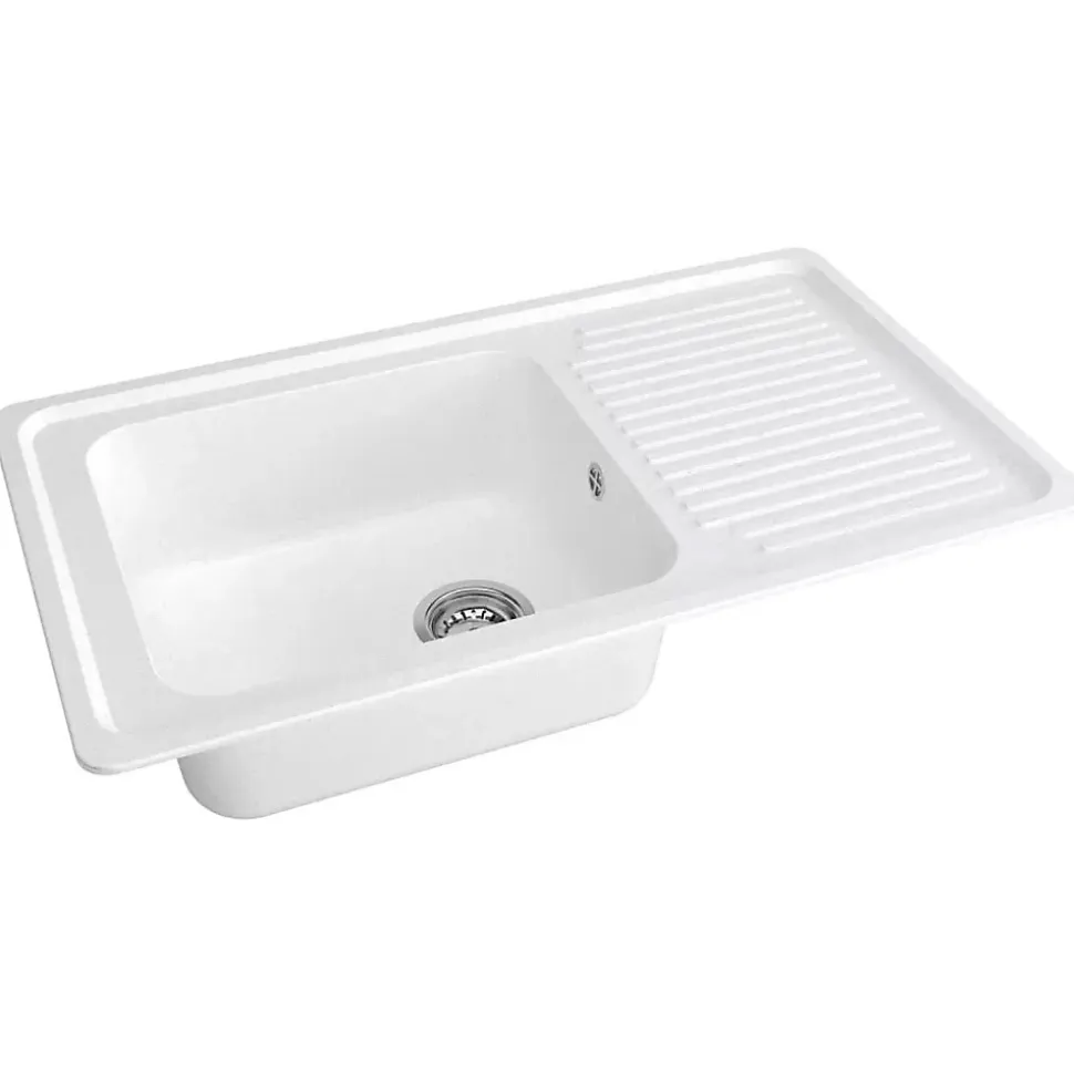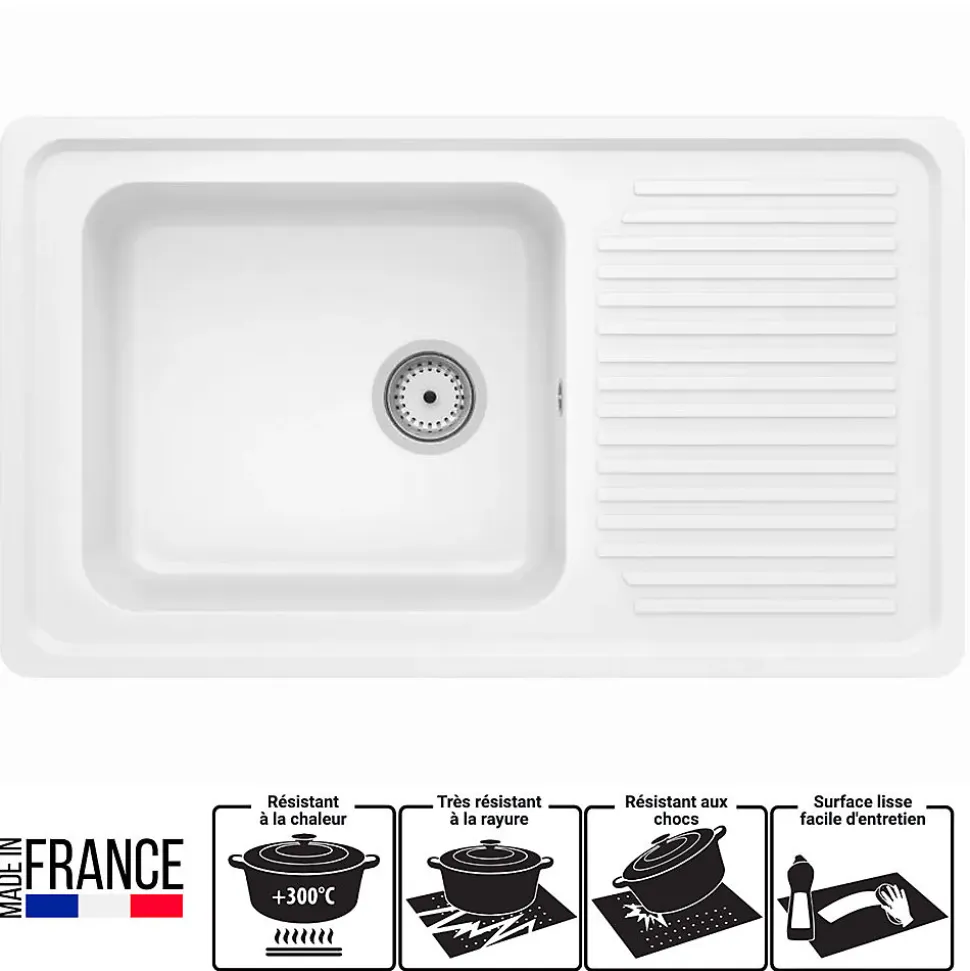 Évier de cuisine réversible à encastrer avec 1 cuve et 1 égouttoir FABRICATION FRANÇAISEOptez pour cet évier en résine minérale composite, un matériau robuste et esthétique, idéal pour un usage quotidien. Avec sa conception réversible, il s?adapte parfaitement à vos besoins, offrant la possibilité d?installer l?égouttoir à gauche ou à droite selon vos préférences. Fabrication durable et résistance optimale Fabriqué en résine minérale composite de haute qualité, cet évier se distingue par sa grande résistance aux chocs, aux rayures et aux températures extrêmes (-40 C à +300 C). Sa couleur blanc moucheté et sa finition soignée ajoutent une touche élégante et moderne à votre cuisine. Détails de l?évier de cuisine : Matière : Résine minérale compositeColoris : blanc mouchetéNombre de cuves : 1Égouttoir : OuiRéversible : OuiType de vidage : ManuelTrou de perçage vidage : Oui (diamètre 90 mm)Trou de perçage robinetterie : NonDimensions de l?évier : 86 x 50 x 22 cmDimensions de la cuve : 43 x 38 x 20 cmEncastrement : Meuble à partir de 50 cmPlan de découpe : 83 x 47 cmPoids : 9 kgAttention, robinetterie non incluse.Contenu de la livraison :1 notice de pose1 schéma de découpe1 système de vidage manuel avec siphon8 équerres de fixationConseils d?entretien :Résiste à une large gamme de températures (-40 C à +300 C).Entretien facile grâce à sa surface lisse et résistante aux produits d?entretien.Nettoyer avec une éponge douce et un détergent non abrasif pour préserver son aspect d?origine. Ce que nous aimons : Polyvalence et adaptabilité : Réversible, cet évier peut être installé avec l’égouttoir à gauche ou à droite selon vos contraintes et préférences.Robustesse et durabilité : Le matériau composite garantit une grande résistance aux chocs et rayures tout en étant facile d?entretien.