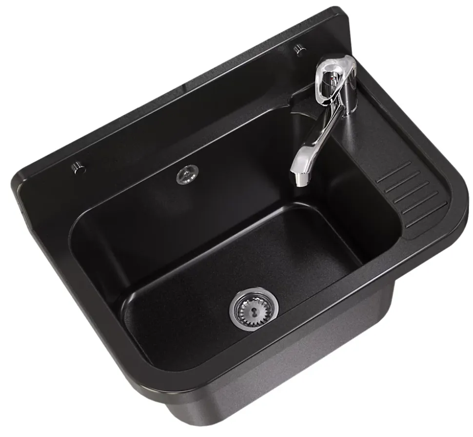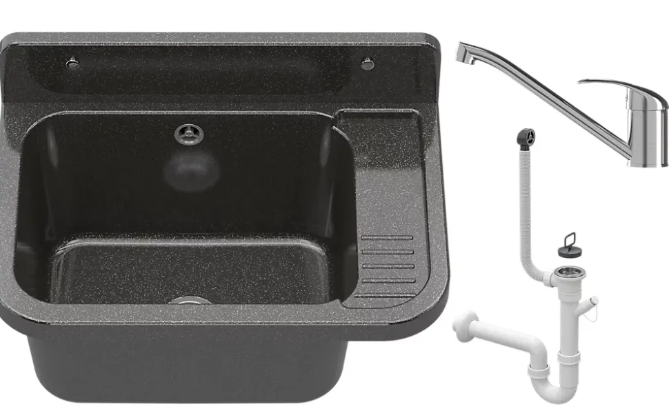 Présentation du produitOffrez à votre garage, buanderie, atelier ou espace de lavage une solution pratique et élégante avec l’évier en granit gris Paron Granitan doté de son robinet extractible noir. Fabriqué en polypropylène durable, cet évier est résistant aux produits chimiques et aux températures élevées. Ce matériau non absorbant garantit une utilisation idéale à la fois en intérieur et en extérieur. Sa finition noire classique à l’aspect marbré apporte une touche d’élégance tout en assurant une excellente fonctionnalité.Caractéristiques principalesRobinet inclus avec bec extractible et finition chromée résistante aux hautes températures et à la décolorationÉvier résistant en polypropylène, adapté aux usages intensifsUtilisation pratique pour divers espaces : maison, atelier ou espaces publicsInstallation simple avec kit complet fourni, y compris siphon et options de raccordement pour lave-linge ou lave-vaisselleConception légère pour une installation rapidePourquoi choisir ce produit ?La combinaison de durabilité, de praticité et de design élégant rend cet évier parfait pour divers besoins. De plus, avec tous les accessoires inclus, vous aurez tout ce dont vous avez besoin pour une installation facile et personnalisée. Le robinet extractible et pivotant permet une utilisation flexible, facilitant le nettoyage des grands objets. Adapté aussi bien à un usage domestique qu’à des espaces professionnels, cet évier garantit une performance à long terme grâce à des matériaux solides et un design étudié.Spécifications techniquesDimensions de l’évier : 50 cm x 34 cm x 31 cmMatériau : PolypropylèneCouleur : NoirPoids : 4 kg (emballage inclus)Contenu du kit : Évier et robinetType d’installation : EncastréForme : Rectangulaire
