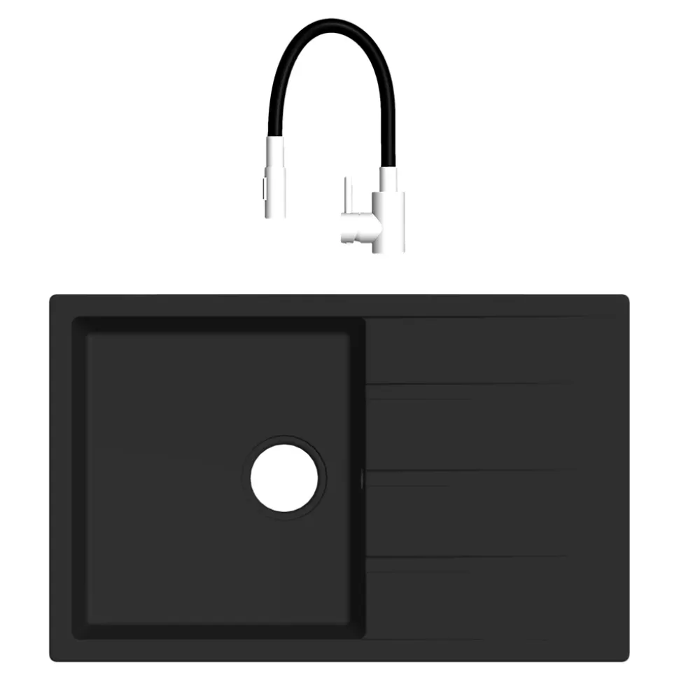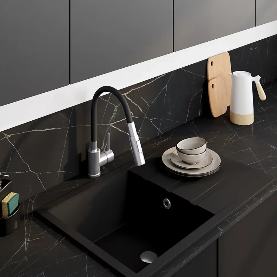 L’évier noir en résine Fossum avec égouttoir et robinet flexible offre une grande polyvalence avec un égouttoir réversible pouvant être installé à gauche ou à droite. Le robinet double fonction flexible inclus crée un aspect homogène et son design moderne le rend idéal pour toutes les cuisines.