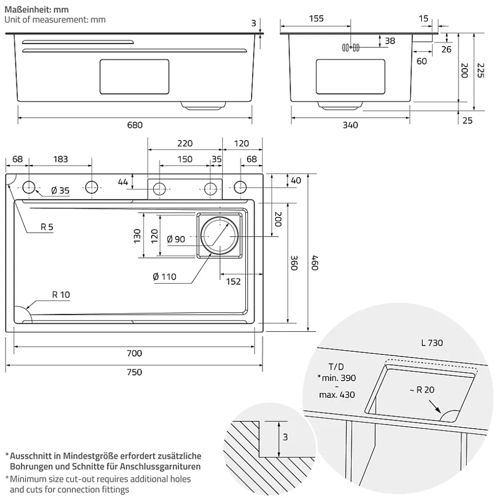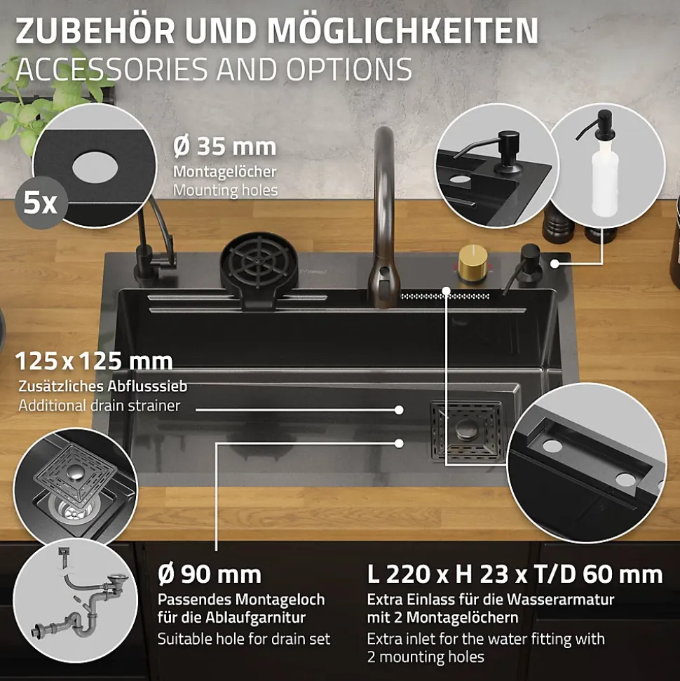Description du produit :Ton nouvel auxiliaire de cuisine – polyvalent et pratique en set completCet évier en inox de 75 x 46 cm est bien plus qu’un simple endroit pour faire la vaisselle. Avec ses tapis d’insonorisation, il crée une atmosphère de travail agréable, tandis que le trop-plein assure une sécurité supplémentaire. Avec ce kit, tu n’as plus besoin d’acheter quoi que ce soit d’autre : Au total, 8 accessoires sont inclus dans la livraison. Parmi eux, un robinet avec douchette extractible et différents modes d’arrosage.Inclus dans la livraison :Un distributeur de savon pratiqueUn robinet flexible avec douchette extractible et différents modes de jetUn insert de planche à découper en boisUn insert de bassin d’eau pour un travail flexibleUn insert de drainage pour faciliter l’égouttageUn tamis d’évacuation pour les gros résidusUn lave-verres ou un lave-verres à pression pour, entre autres, les verresUn petit robinet supplémentaire pour encore plus de flexibilitéUne garniture d’écoulement et de trop-pleinÀ cela s’ajoute une fonction de chute d’eau, idéale pour le nettoyage des fruits et légumes.Cet ensemble d’éviers est le complément parfait pour chaque cuisine et allie fonctionnalité et design moderne.Caractéristiques de l’appareil :Acier inoxydable solideAvec garniture d’écoulementAvec trop-pleinInsonorisationFeuillures pour un écoulement optimal de l’eau5 trous de montage pour les garnitures de raccordementProtection contre la condensationRails intégrés pour un positionnement et une disposition flexibles des insertsRobinetterie multifonctionnelleContenu de la livraison :1x évier encastré1x robinet avec douchette extractible1x petit robinet1x insert pour planche à découper en bois1x garniture d’écoulement et de trop-plein1x distributeur de savon1x rinceur à pression1x égouttoir1x égouttoir