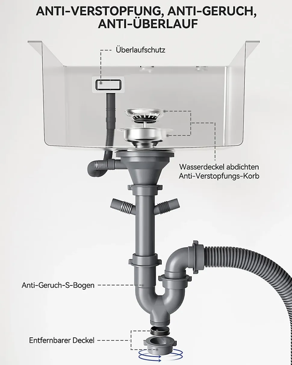 - ✔ FACILE À UTILISER : L’évier encastrable est équipé d’un siphon de haute qualité, d’un drain en tube en U peu encombrant et d’un trop-plein. Grâce aux deux raccords supplémentaires sur l’évacuation, vous pouvez connecter votre lave-vaisselle ou d’autres appareils au siphon et ainsi rendre votre espace cuisine plus propre.