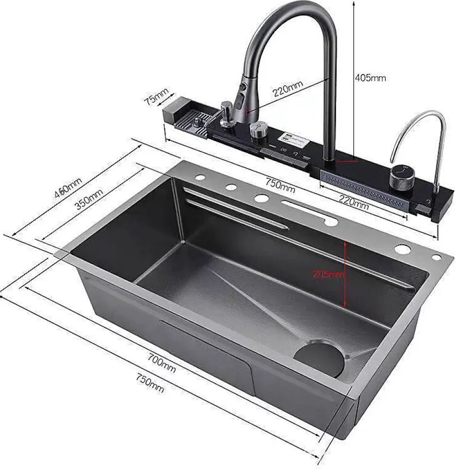 Description du produit :Ses dimensions sont de 75 cm de large, 22 cm de haut et 46 cm de profondeur.Évier nano rectangulaire gris Cerus Kleenmac avec affichage numérique.Fabriqué en acier inoxydable 304 brossé.L’affichage numérique indique la température de l’eau et le temps d’utilisation en temps réel.Il dispose d’une lumière d’ambiance bleue qui s’allume lorsque l’eau commence à couler.5 modes d’eau : robinet extractible avec 3 modes de sortie d’eau plus 2 modes cascade pour nettoyer de grandes surfaces.Contrôle indépendant de 2 cascades, lave-verres et robinets amovibles et Plus un autre robinet d’eau pure dans le coin droit.Conception à double marche sur le côté de l’évier. Une division plus efficace.Idéal pour une utilisation dans des endroits tels que les bars, les balcons, les tables à manger, les cuisines, etc.Coin R conçu pour faciliter le nettoyage et l’hygiène des coins.Il dispose d’un drain sur le côté droit, d’un angle en bas pour un drainage en douceur, d’un trop-plein sur le côté droit pour éviter un débordement excessif de l’eau.Son silencieux en caoutchouc et sa couche anti-condensation Nano épaissie située au fond de l’évier sont conçus pour réduire le bruit et garder l’armoire propre et bien rangée.Ce produit comprend un évier de cuisine nano (SS 304), un robinet d’eau de pluie à deux niveaux avec affichage numérique intégré et un petit robinet d’eau pure, une planche à découper, un petit lavabo, des tuyaux d’égout, un égouttoir, un flacon distributeur de savon et d’autres accessoires adaptés.