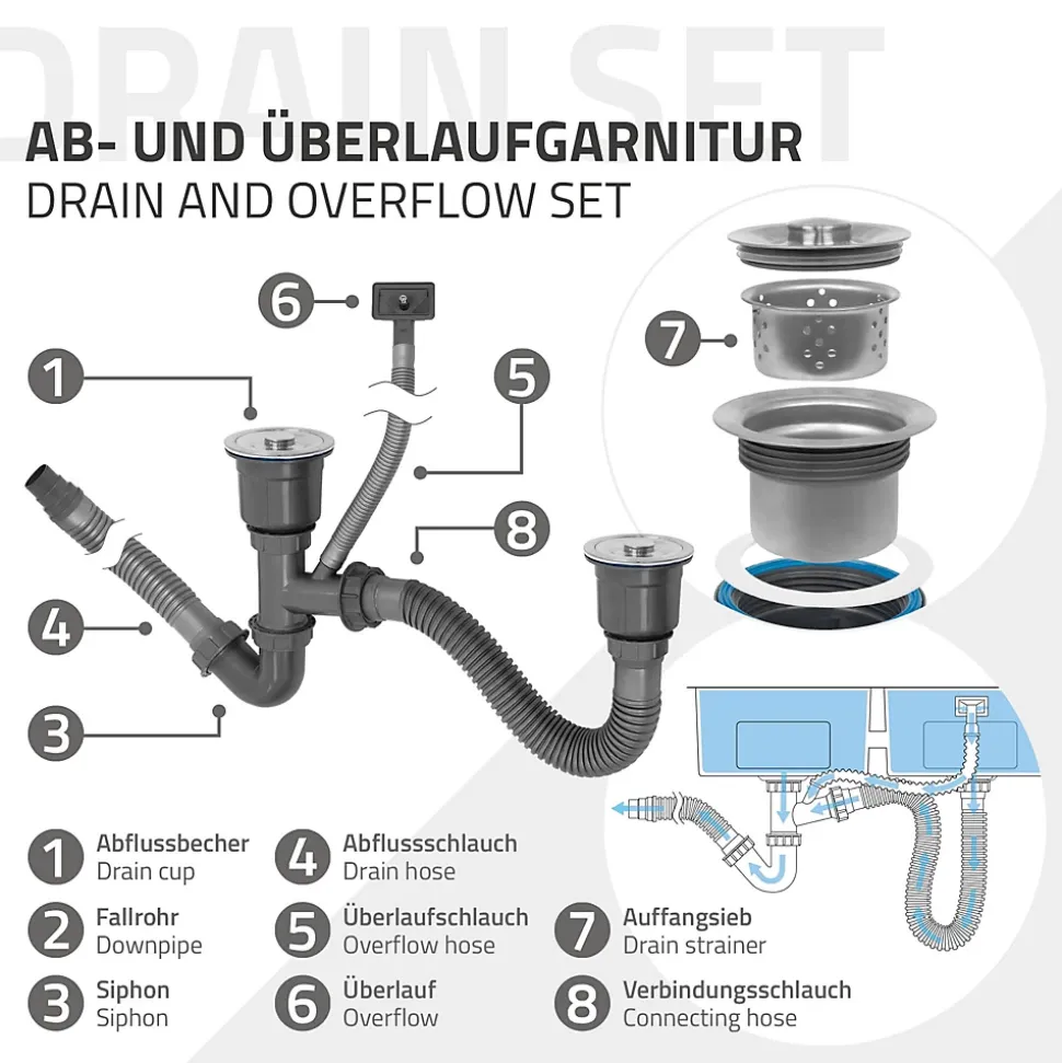 Description du produit:Double fonctionnalité en parfaite harmonie : ton nouvel évier double en inox (81,5 x 40 cm).Découvre le confort et l’élégance d’un évier encastré spacieux dans ta cuisine ! Avec ce double évier en inox de haute qualité (81,5 x 40 cm), tu disposes non seulement de suffisamment de place pour tous tes travaux de cuisine, mais aussi d’un design intemporel qui s’intègre parfaitement à tout environnement de cuisine.Aperçu de tes avantages:Double confort de travail : deux vasques spacieuses d’une profondeur de 19 cm chacune t’offrent suffisamment de place pour laver, égoutter et préparer.Écoulement optimal de l’eau : les plis dans la cuve assurent un écoulement libre de l’eau et empêchent l’eau de stagner.Montage flexible : qu’il soit encastré, à poser ou à encastrer, cet évier s’adapte parfaitement à tes besoins individuels et aux circonstances.Acier inoxydable de haute qualité : l’évier est fabriqué en acier inoxydable durable, hygiénique et facile à entretenir.Vaisselle silencieuse : les tapis insonorisants intégrés atténuent les bruits lors de la vaisselle et garantissent un calme agréable dans ta cuisine.Protection contre la condensation : un revêtement de protection spécial empêche la formation de condensation gênante à l’extérieur de l’évier.Garniture de vidage incluse : la garniture de vidage adaptée est incluse dans la livraison, de sorte que tu peux utiliser ton évier immédiatement après le montage.Cet évier en acier inoxydable est le choix parfait pour toi si tu accordes de l’importance à la qualité, à la fonctionnalité et au design moderne.Livraison:1 x évier double1 x garniture d’écoulement et de trop-pleinAttention: un robinet n’est pas inclus dans la livraison!Information technique:Matériau : acier inoxydableCouleur : argentPoids : 8,4 kgDimensions : 815 x 400 mmProfondeur cuve : 190 mmHauteur : 200 mmÉpaisseur du matériau du bassin : 1 mmEpaisseur du panneau supérieur : 1 mm
