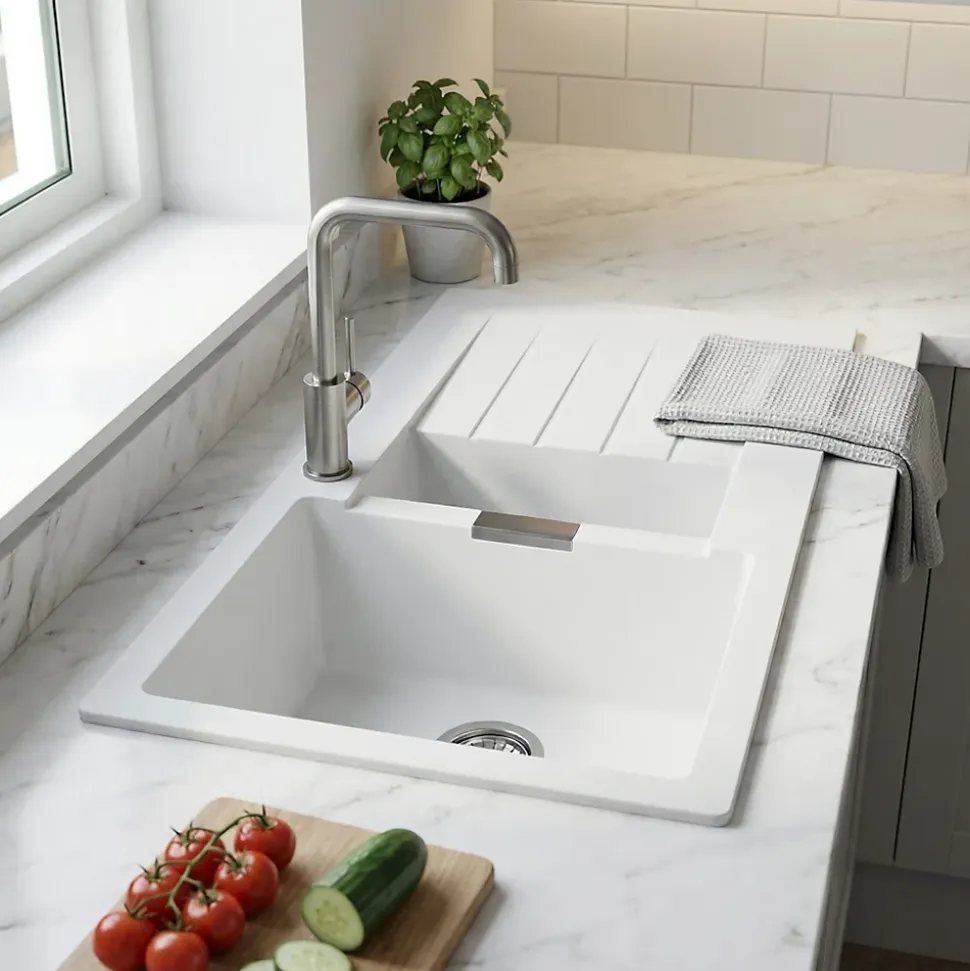 Évier en composite de quartz blanc 1,5 bacs à encastrer Galvani