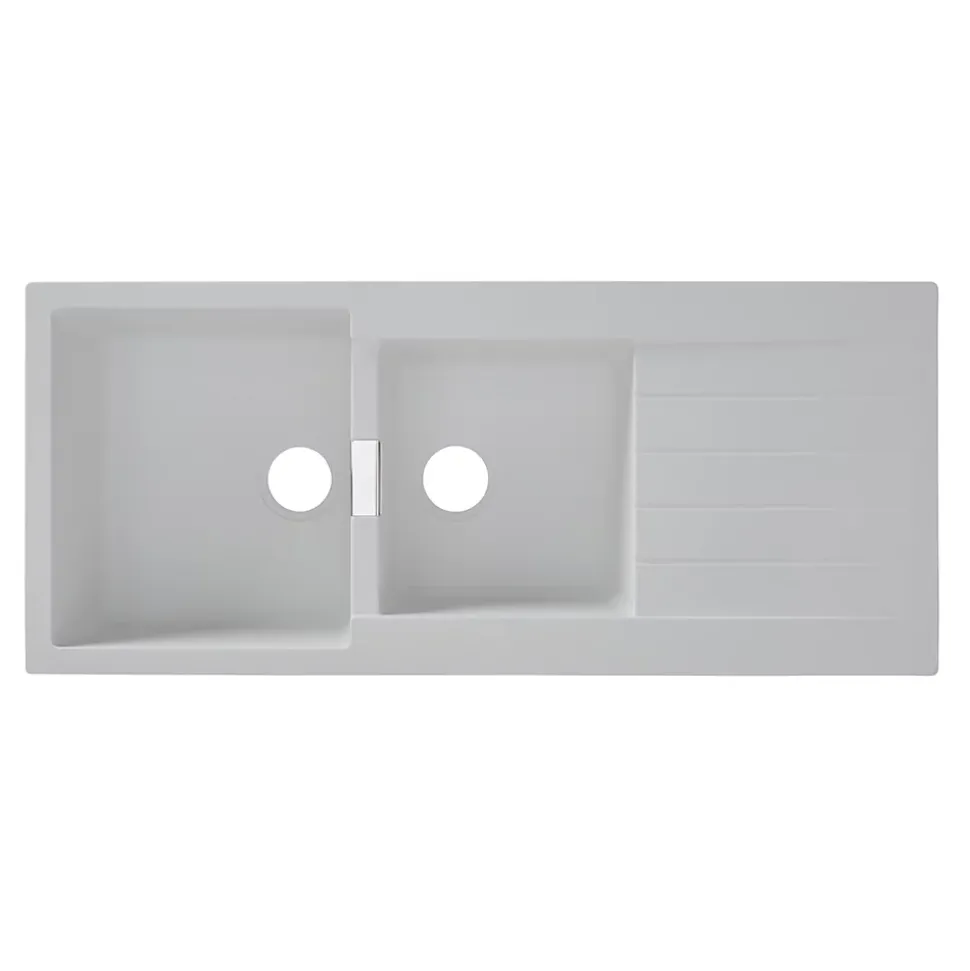 Complément indispensable à toute cuisine, cet évier noir avec égouttoir de la gamme Galvani de Cooke & Lewis est fabriqué en granit robuste. Les deux bacs sont parfaits pour le lavage et l’égouttage des légumes lors d’une activité fréquente en cuisine. Nos éviers en granit sont extrêmement durables et offrent une résistance élevée à la chaleur, aux taches et aux rayures