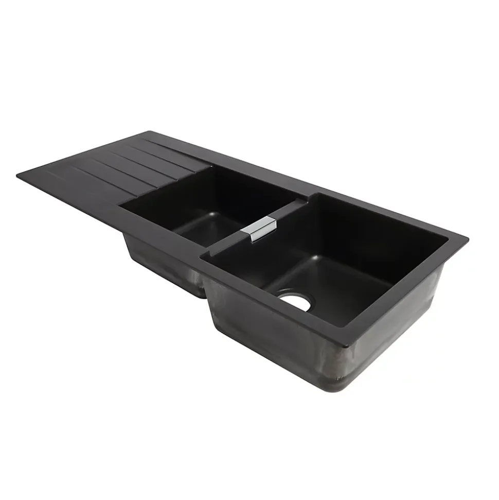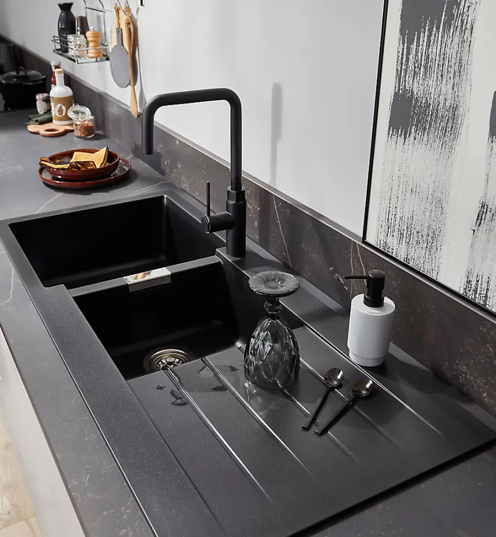 Complément indispensable à toute cuisine, cet évier noir avec égouttoir de la gamme Galvani de Cooke & Lewis est fabriqué en granit robuste. Les deux bacs sont parfaits pour le lavage et l’égouttage des légumes lors d’une activité fréquente en cuisine. Nos éviers en granit sont extrêmement durables et offrent une résistance élevée à la chaleur, aux taches et aux rayures