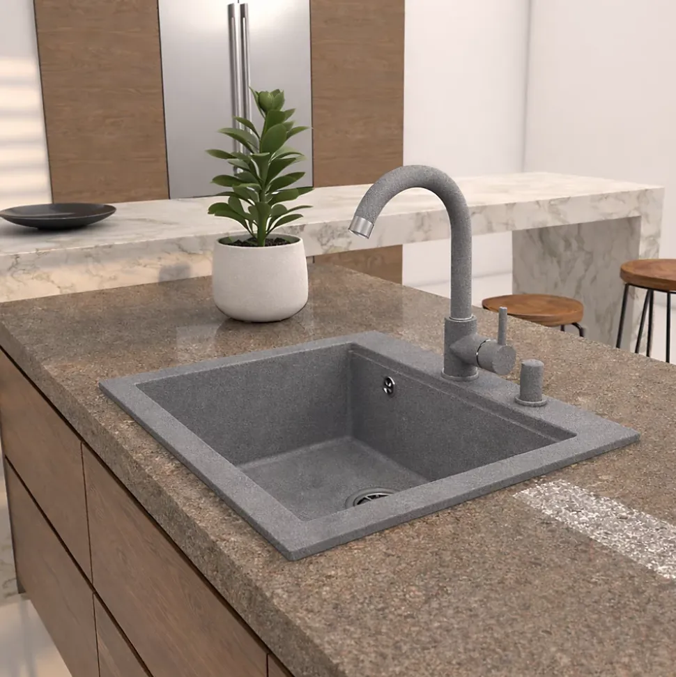 Evier au style moderne, épuré et chaleureux.Type d’évier : évier à encastrer, à cuve unique, de forme rectangulaire aux angles légèrement arrondis.Matériau et couleur : Granit de synthèse, de couleur NOIR, ce qui lui donne un aspect très contemporain.Cet évier s’intègre harmonieusement dans une cuisine aux façades en bois et aux lignes minimalistes, renforçant une ambiance naturelle et haut de gamme.Evier à la fois fonctionnel, élégant et parfaitement adapté à une cuisine contemporaine.Evier 1 bac carré sans égouttoir. En granit GRIS. Dimension totale:565X510mm (bac:495x357x200). Fourni sans mitigeur avec vidage manuel. Granit: 80% quartz naturel, 20% résine). Pour un meuble sous évier de 60cm minimum. Garantie 15ans.