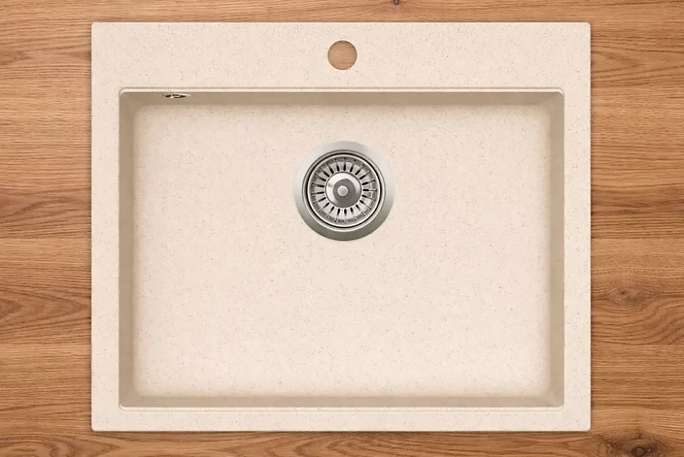 Evier au style moderne, épuré et chaleureux.Type d’évier : évier à encastrer, à cuve unique, de forme rectangulaire aux angles légèrement arrondis.Matériau et couleur : Granit de synthèse, de couleur beige sable / crème, ce qui lui donne un aspect doux et contemporain.Cet évier s’intègre harmonieusement dans une cuisine aux façades en bois et aux lignes minimalistes, renforçant une ambiance naturelle et haut de gamme.Evier à la fois fonctionnel, élégant et parfaitement adapté à une cuisine contemporaine.Evier 1 bac carré sans égouttoir. En granit SABLE. Dimension totale:565X510mm (bac:495x357x200). Fourni sans mitigeur avec vidage manuel. Granit: 80% quartz naturel, 20% résine). Pour un meuble sous évier de 60cm minimum. Garantie 15ans.