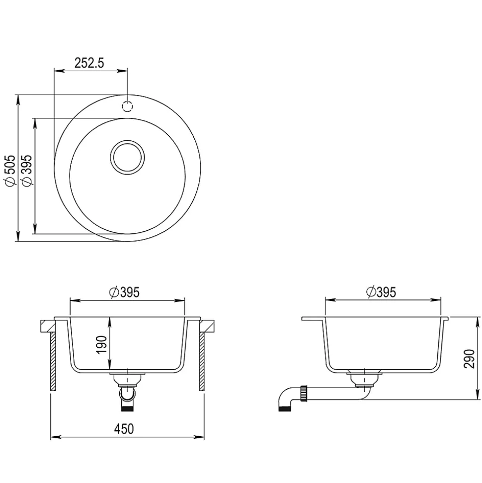 Évier de cuisine rond à encastrer, au design moderne et élégant. Fabriqué dans un matériau composite résistant, il offre une excellente durabilité face aux rayures, aux chocs et aux variations de température.Sa finition légèrement mouchetée apporte une touche chaleureuse et s’intègre facilement dans tous les styles de cuisine, classiques ou contemporains.Caractéristiques :Forme : rondeType : évier à encastrerMatériau : granit de synthèse Bonde en acier inoxydable inclusePerçage pour robinetEntretien facile et surface non poreuseIdéal pour une cuisine fonctionnelle et esthétique.Evier rond (dimensions totales 505×505) en granit NOIR. 1 bac de dimensions 395x3995x190. Fourni sans mitigeur avec bonde, siphon et vidage manuel. Granit 80% quartz, 20% acrylique). Pour meuble sous-évier de 45cm minimum. Garantie 15ans.