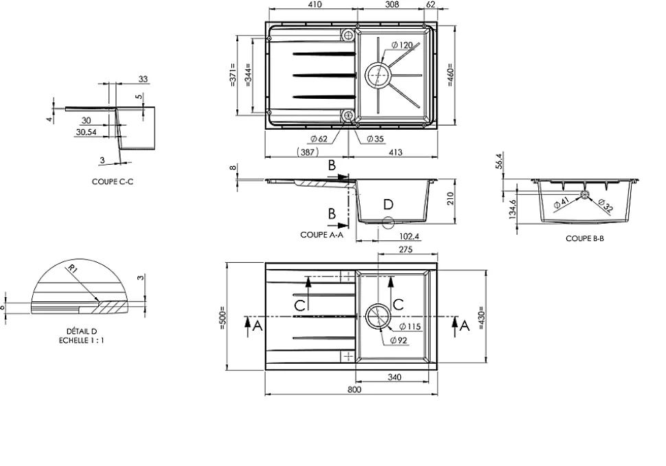 - L’évier est adapté pour les meubles à partir de 50 cm