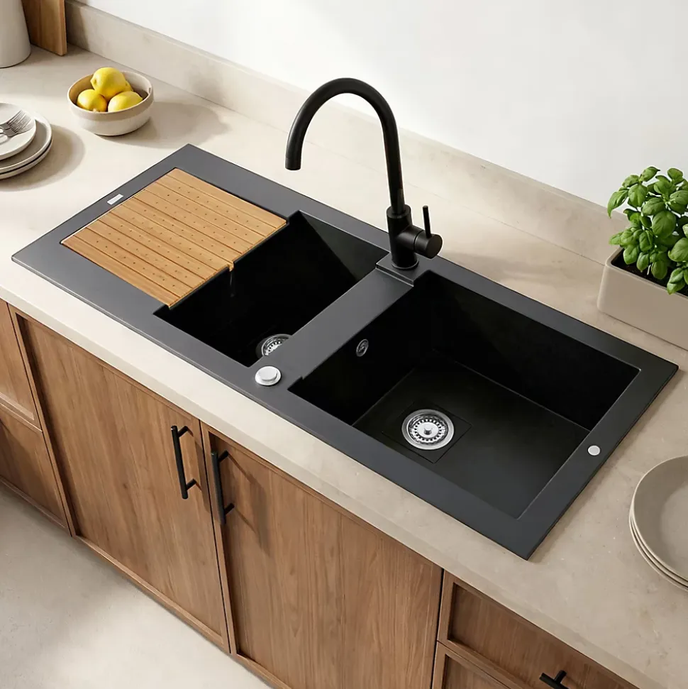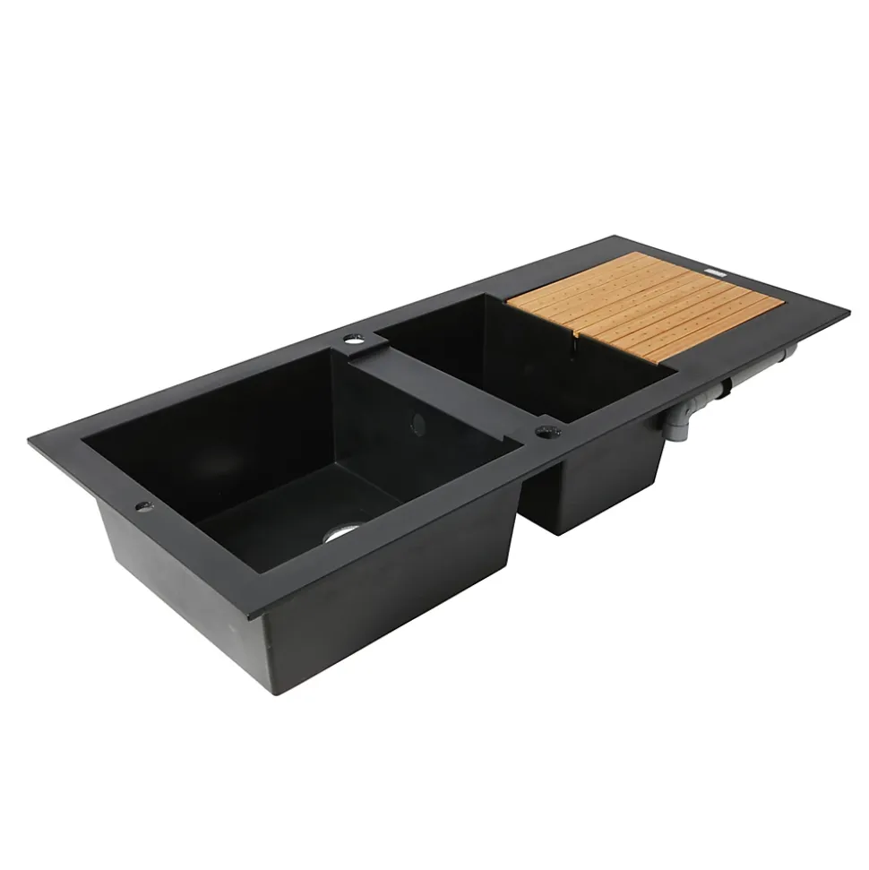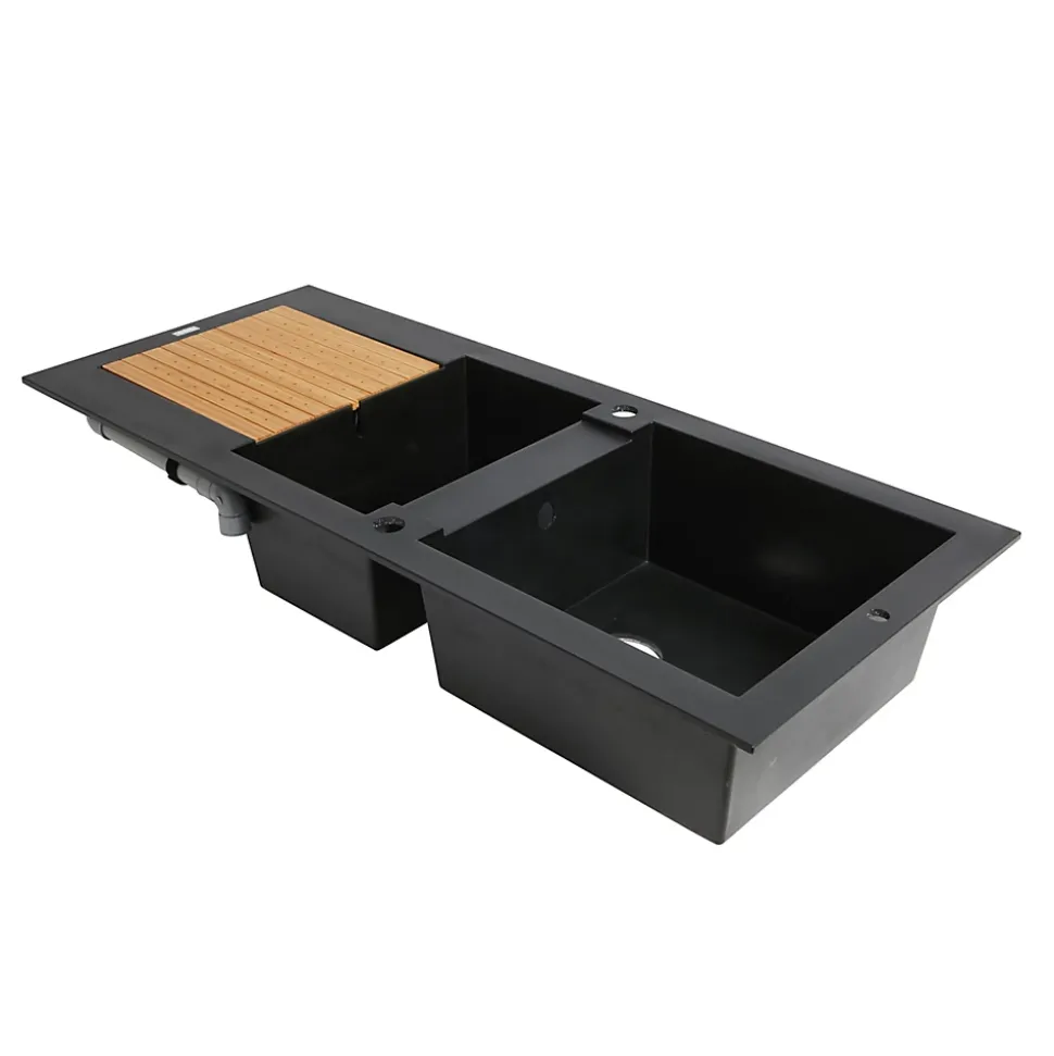 - Planche/égouttoir réversible : 1 côté égouttoir, 1 côte planche à découper
