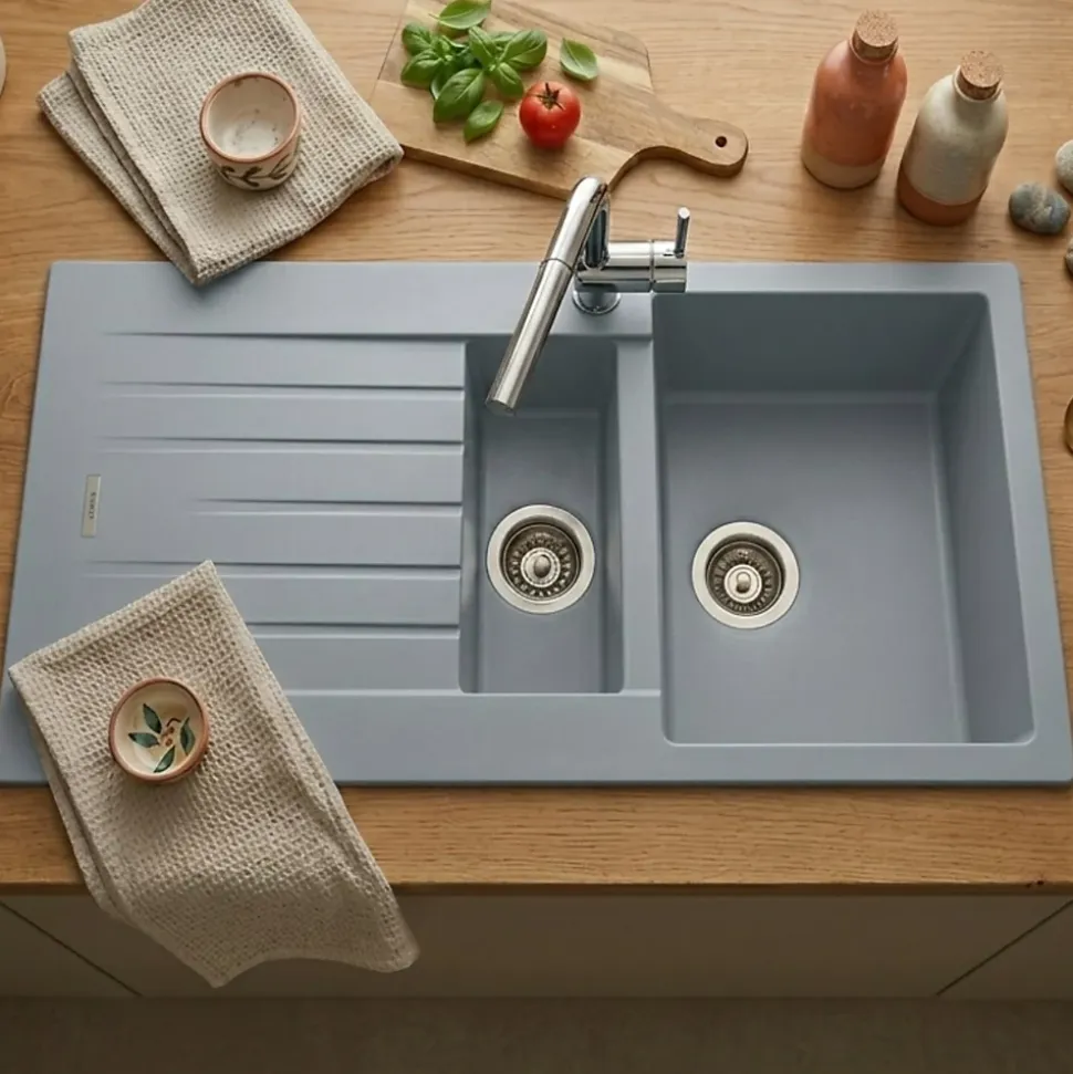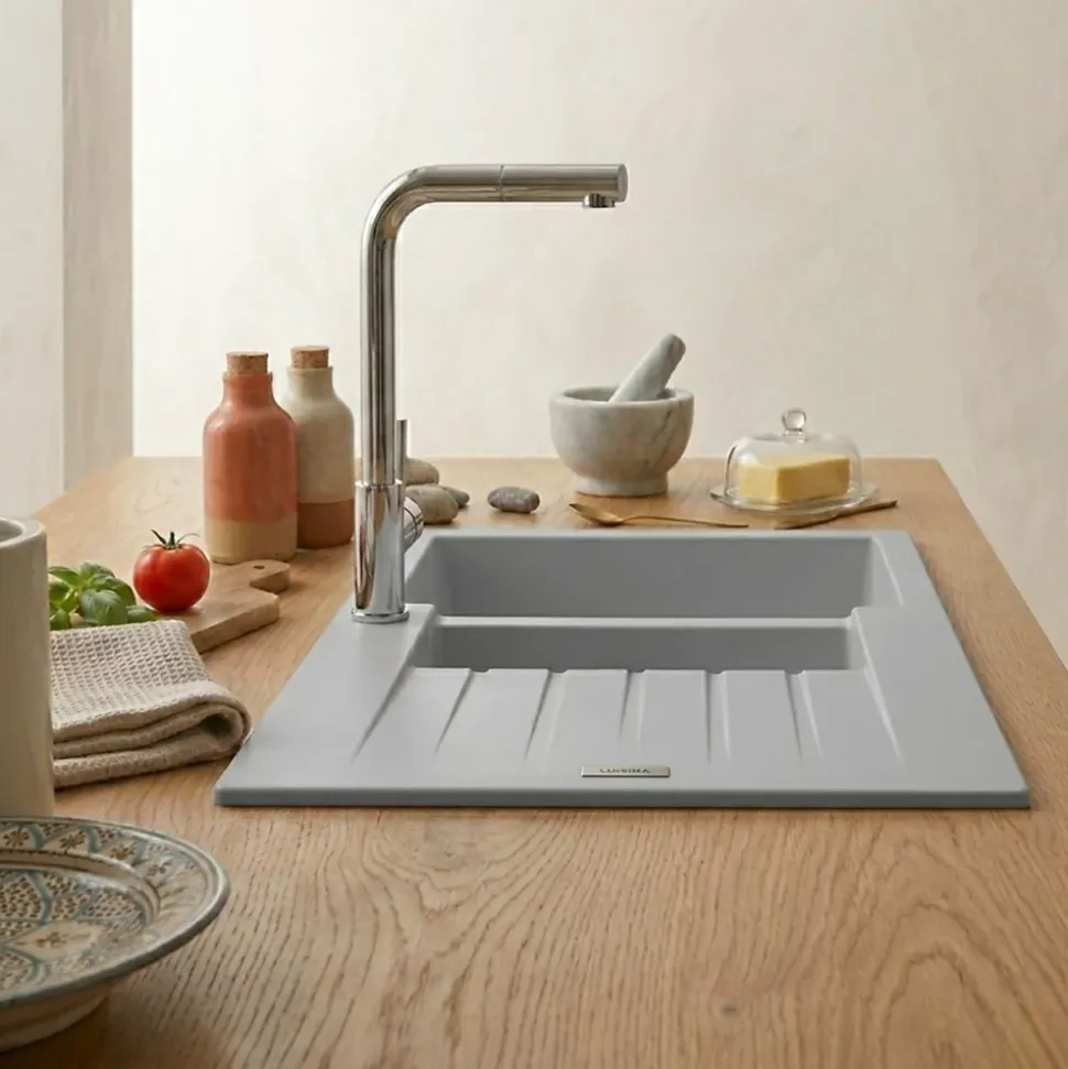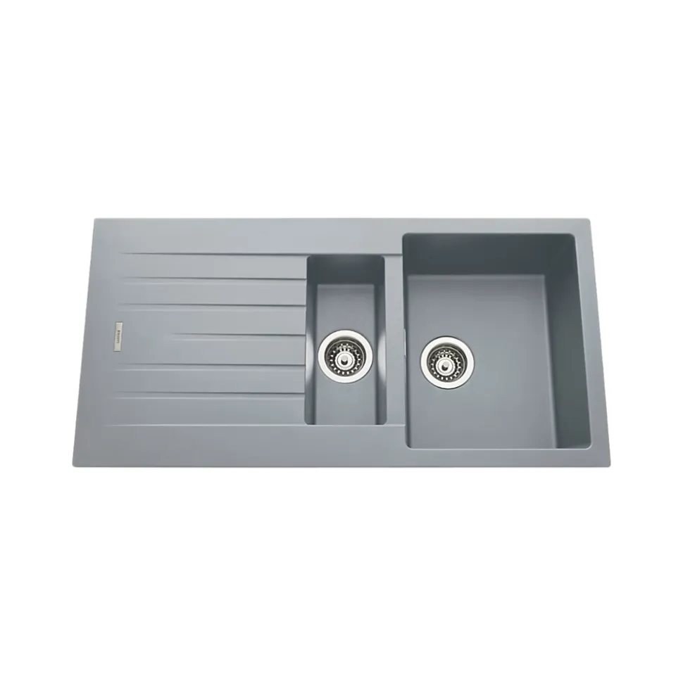 POINTS FORTS : • Évier encastrable 100×50 cm • • Meuble sous évier 60 cm minimum• • Evier vidage manuel • • Evier réversible CARACTÉRISTIQUES : • Équipements inclus : bonde(s), siphon, trop plein, tuyaux d’évacuation • Marque : Luisina • Matériau : Granit • Type de pose : à encastrer • Positionnement égouttoir : réversible • Coloris : Gris • Emplacement robinetterie : pré-marqué • Nombre de bacs : 1 bac 1/2 • Poids net (Kg) : 15.72 • Trop plein : oui • Sous-meuble : 60 cm • Longueur (mm) : 1000 • Largeur (mm) : 500 • Longueur d’encastrement (mm) : 980 • Largeur d’encastrement (mm) : 480 • Grande dimension cuve 1 (mm) : 430 • Petite dimension cuve 1 (mm) : 345 • Profondeur cuve 1 (mm) : 200 • Diamètre bonde cuve 1 (mm) : 90 • Grande dimension cuve 2 (mm) : 340 • Petite dimension cuve 2 (mm) : 155 • Profondeur cuve 2 (mm) : 90 • Diamètre bonde cuve 2 (mm) : 90 • Bon à savoir : ce produit ne présente pas de spécificités supplémentaires • Vidage : manuel • Référence vidage : le vidage est déjà inclus