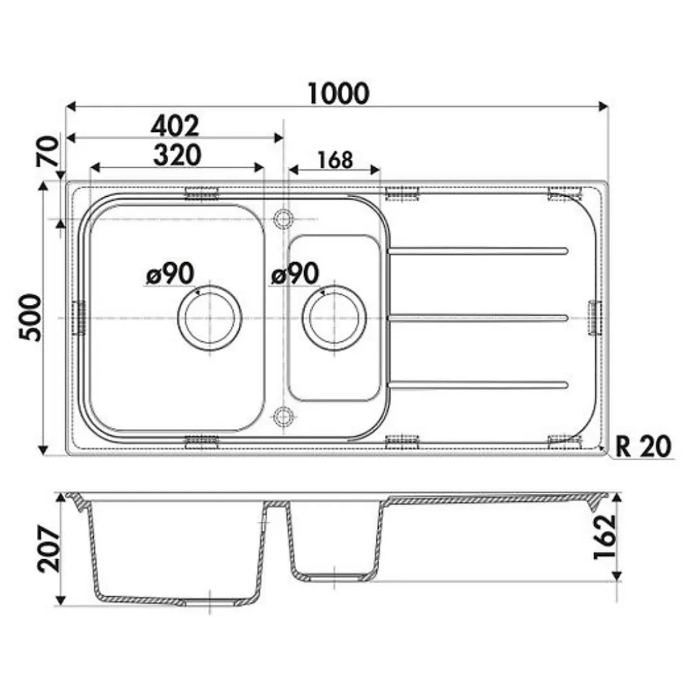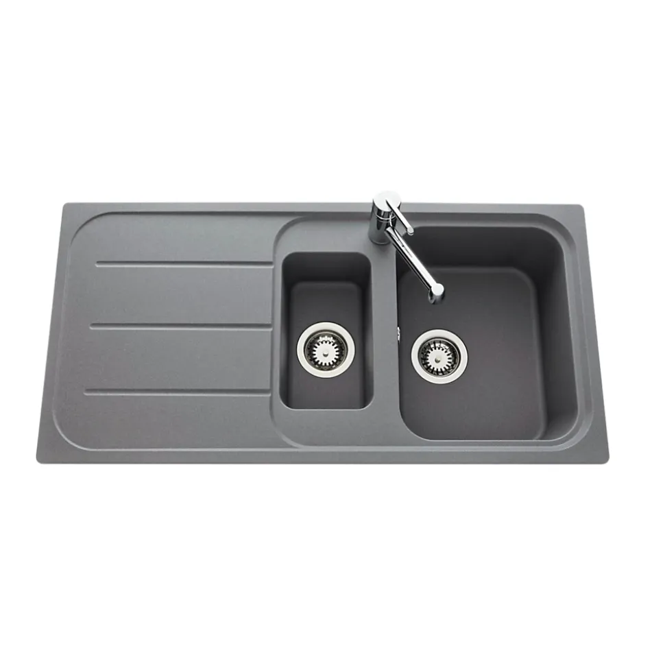POINTS FORTS : • Évier encastrable 100×50 cm • • Evier vidage manuel • • Meuble sous évier 60 cm minimum • • Évier réversible CARACTÉRISTIQUES : • Équipements inclus : bonde(s), siphon, trop plein, tuyaux d’évacuation • Marque : Ewi • Matériau : Granit • Type de pose : à encastrer • Positionnement égouttoir : réversible • Coloris : Gris • Emplacement robinetterie : pré-marqué • Nombre de bacs : 1 bac 1/2 • Poids net (Kg) : 13.9 • Trop plein : oui • Sous-meuble : 60 cm • Longueur (mm) : 1000 • Largeur (mm) : 500 • Longueur d’encastrement (mm) : 984 • Largeur d’encastrement (mm) : 484 • Grande dimension cuve 1 (mm) : 410 • Petite dimension cuve 1 (mm) : 320 • Profondeur cuve 1 (mm) : 207 • Diamètre bonde cuve 1 (mm) : 90 • Grande dimension cuve 2 (mm) : 300 • Petite dimension cuve 2 (mm) : 168 • Profondeur cuve 2 (mm) : 162 • Diamètre bonde cuve 2 (mm) : 90 • Bon à savoir : ce produit ne présente pas de spécificités supplémentaires • Vidage : manuel • Référence vidage : le vidage est déjà inclus