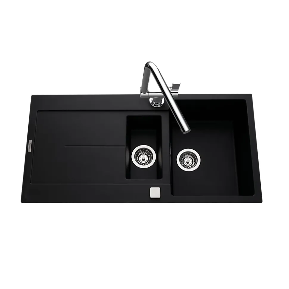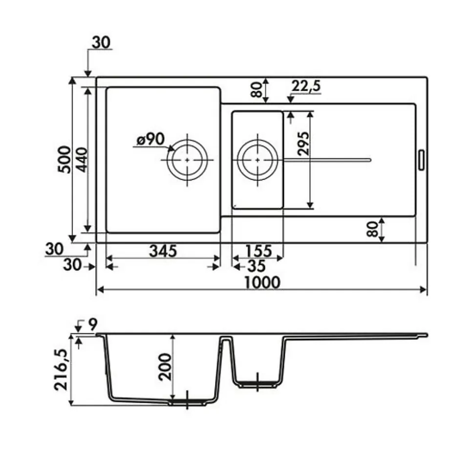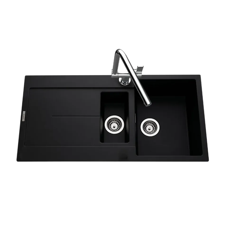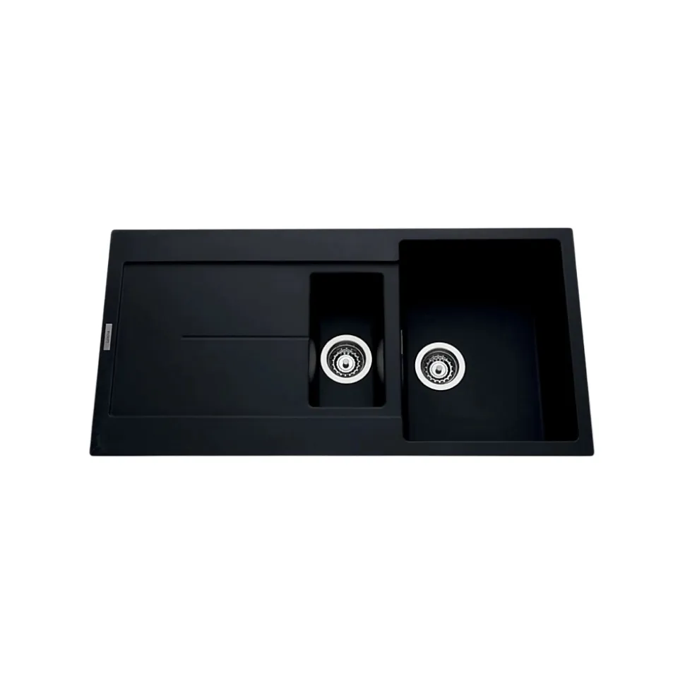 POINTS FORTS : • Évier encastrable 100×50 cm •• Meuble sous évier 60 cm minimum •• Evier vidage manuel •• Évier réversible CARACTÉRISTIQUES : • Équipements inclus : bonde(s), siphon, trop plein, tuyaux d’évacuation • Marque : Luisina • Matériau : Granit • Type de pose : à encastrer • Positionnement égouttoir : réversible • Coloris : Noir • Emplacement robinetterie : pré-marqué • Nombre de bacs : 1 bac 1/2 • Poids net (Kg) : 15.7 • Trop plein : oui • Sous-meuble : 60 cm • Longueur (mm) : 1000 • Largeur (mm) : 500 • Longueur d’encastrement (mm) : 980 • Largeur d’encastrement (mm) : 480 • Grande dimension cuve 1 (mm) : 440 • Petite dimension cuve 1 (mm) : 345 • Profondeur cuve 1 (mm) : 200 • Diamètre bonde cuve 1 (mm) : 90 • Grande dimension cuve 2 (mm) : 295 • Petite dimension cuve 2 (mm) : 155 • Profondeur cuve 2 (mm) : 146 • Diamètre bonde cuve 2 (mm) : 90 • Bon à savoir : ce produit ne présente pas de spécificités supplémentaires • Vidage : manuel • Référence vidage : le vidage est déjà inclus
