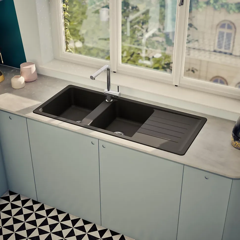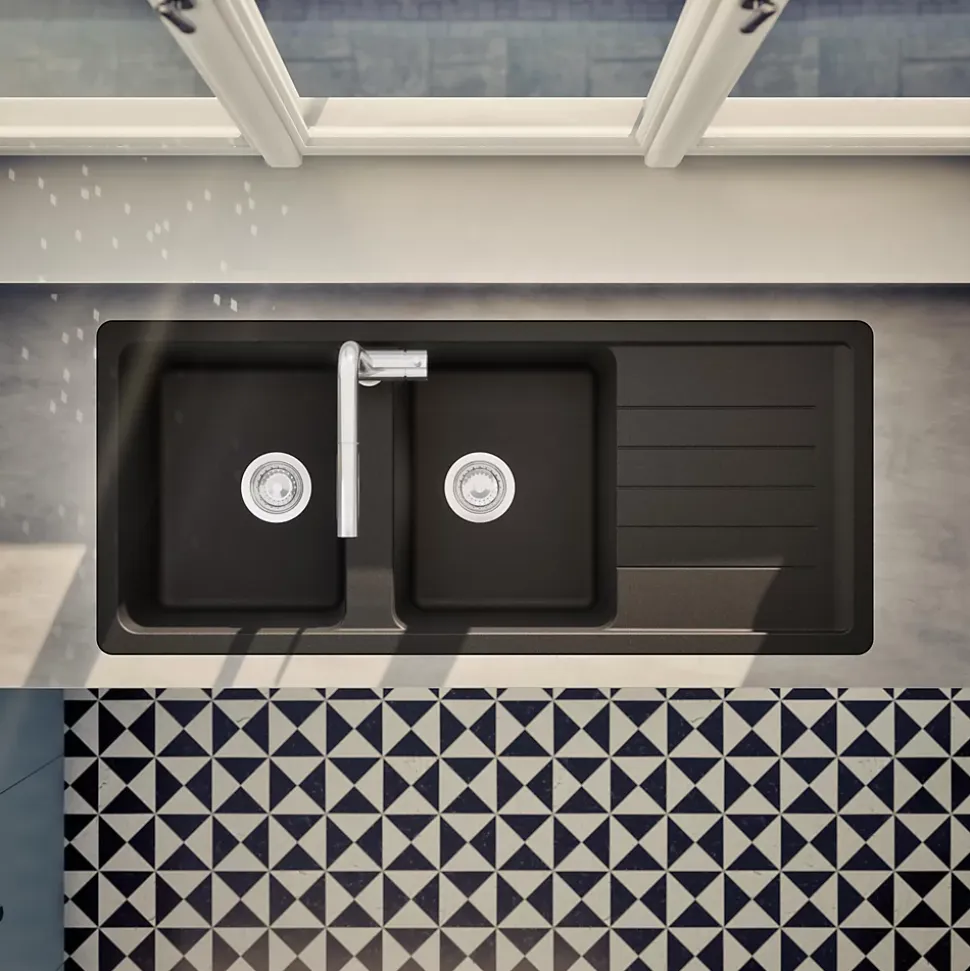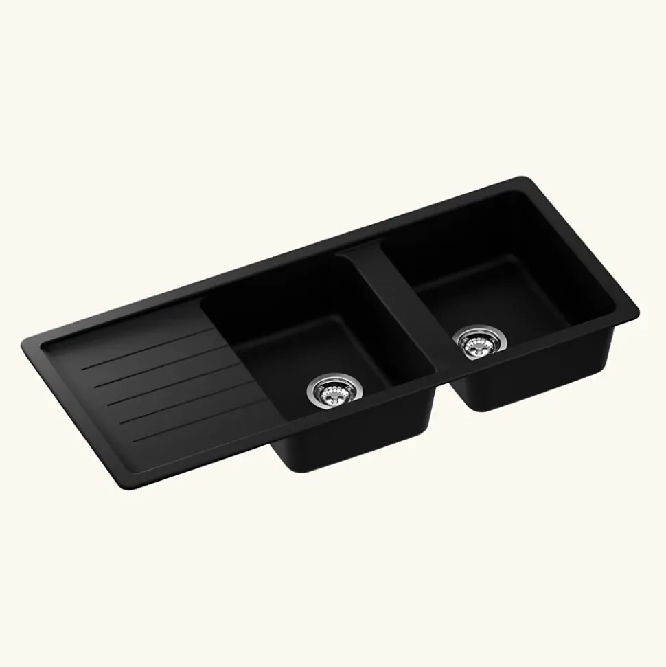 POINTS FORTS : CARACTÉRISTIQUES : • Équipements inclus : bonde(s), siphon, trop plein, tuyaux d’évacuation • Marque : Schock • Matériau : Granit • Type de pose : à encastrer • Positionnement égouttoir : réversible • Coloris : Noir • Emplacement robinetterie : pré-marqué • Nombre de bacs : 2 bacs • Poids net (Kg) : 19.6 • Trop plein : oui • Sous-meuble : 80 cm • Longueur (mm) : 1160 • Largeur (mm) : 500 • Longueur d’encastrement (mm) : 1140 • Largeur d’encastrement (mm) : 480 • Grande dimension cuve 1 (mm) : 432 • Petite dimension cuve 1 (mm) : 337 • Profondeur cuve 1 (mm) : 175 • Diamètre bonde cuve 1 (mm) : 90 • Grande dimension cuve 2 (mm) : 432 • Petite dimension cuve 2 (mm) : 337 • Profondeur cuve 2 (mm) : 175 • Diamètre bonde cuve 2 (mm) : 90 • Bon à savoir : ce produit ne présente pas de spécificités supplémentaires • Vidage : manuel • Référence vidage : le vidage est déjà inclus
