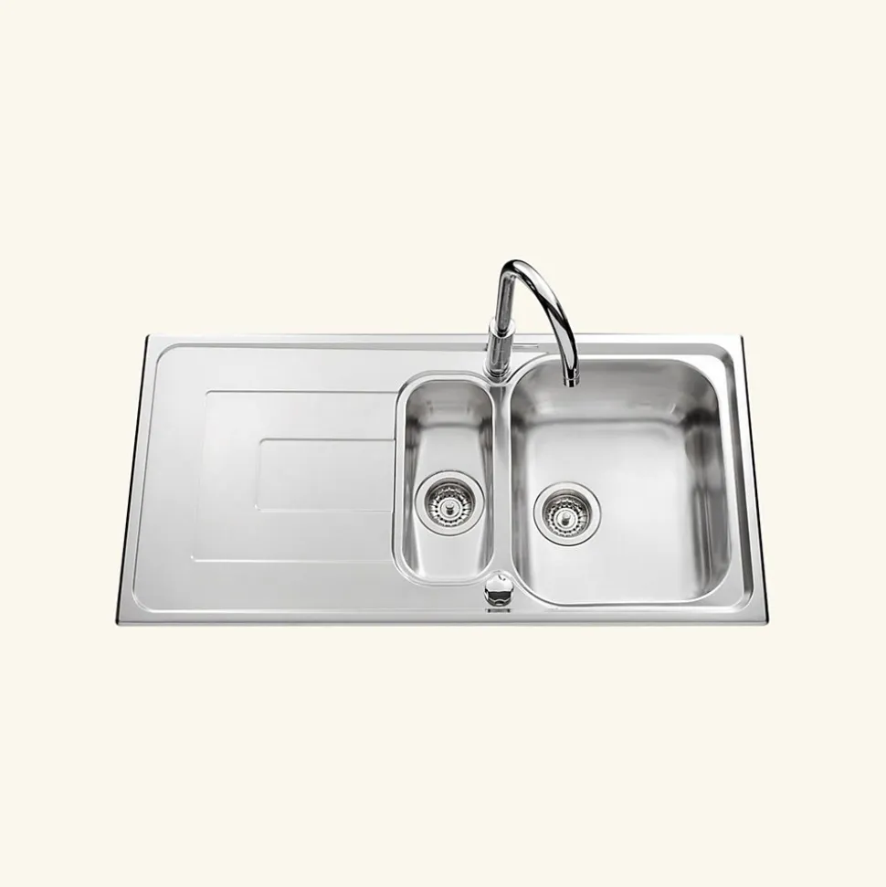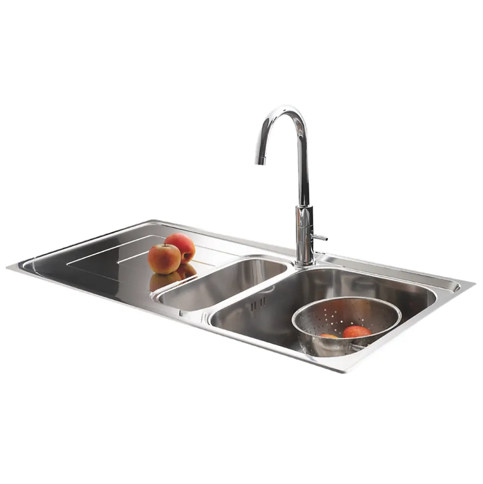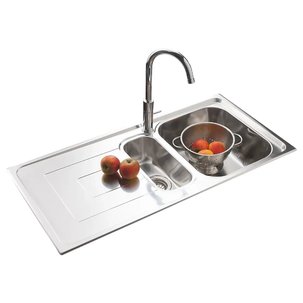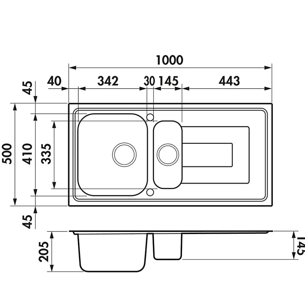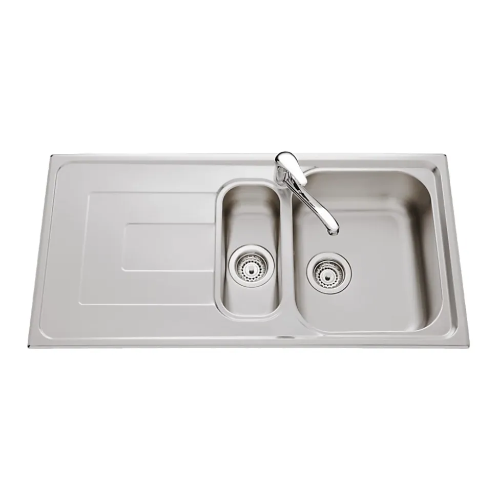 POINTS FORTS : • Évier encastrable 100×50 cm •• Meuble sous évier 60 cm minimum•• Evier vidage manuel •• Évier réversible CARACTÉRISTIQUES : • Équipements inclus : bonde(s), siphon, trop plein, tuyaux d’évacuation • Marque : Luisina • Matériau : Inox • Type de pose : à encastrer • Positionnement égouttoir : réversible • Coloris : Inox • Emplacement robinetterie : non percé • Nombre de bacs : 1 bac 1/2 • Poids net (Kg) : 4.6 • Trop plein : oui • Sous-meuble : 60 cm • Longueur (mm) : 1000 • Largeur (mm) : 500 • Longueur d’encastrement (mm) : 980 • Largeur d’encastrement (mm) : 480 • Grande dimension cuve 1 (mm) : 410 • Petite dimension cuve 1 (mm) : 342 • Profondeur cuve 1 (mm) : 190 • Diamètre bonde cuve 1 (mm) : 90 • Grande dimension cuve 2 (mm) : 335 • Petite dimension cuve 2 (mm) : 145 • Profondeur cuve 2 (mm) : 130 • Diamètre bonde cuve 2 (mm) : 90 • Bon à savoir : L’inox de cet évier mesure 1mm d’épaisseur. L’évier est équipé d’un vidage manuel gain de place. • Vidage : manuel • Référence vidage : le vidage est déjà inclus