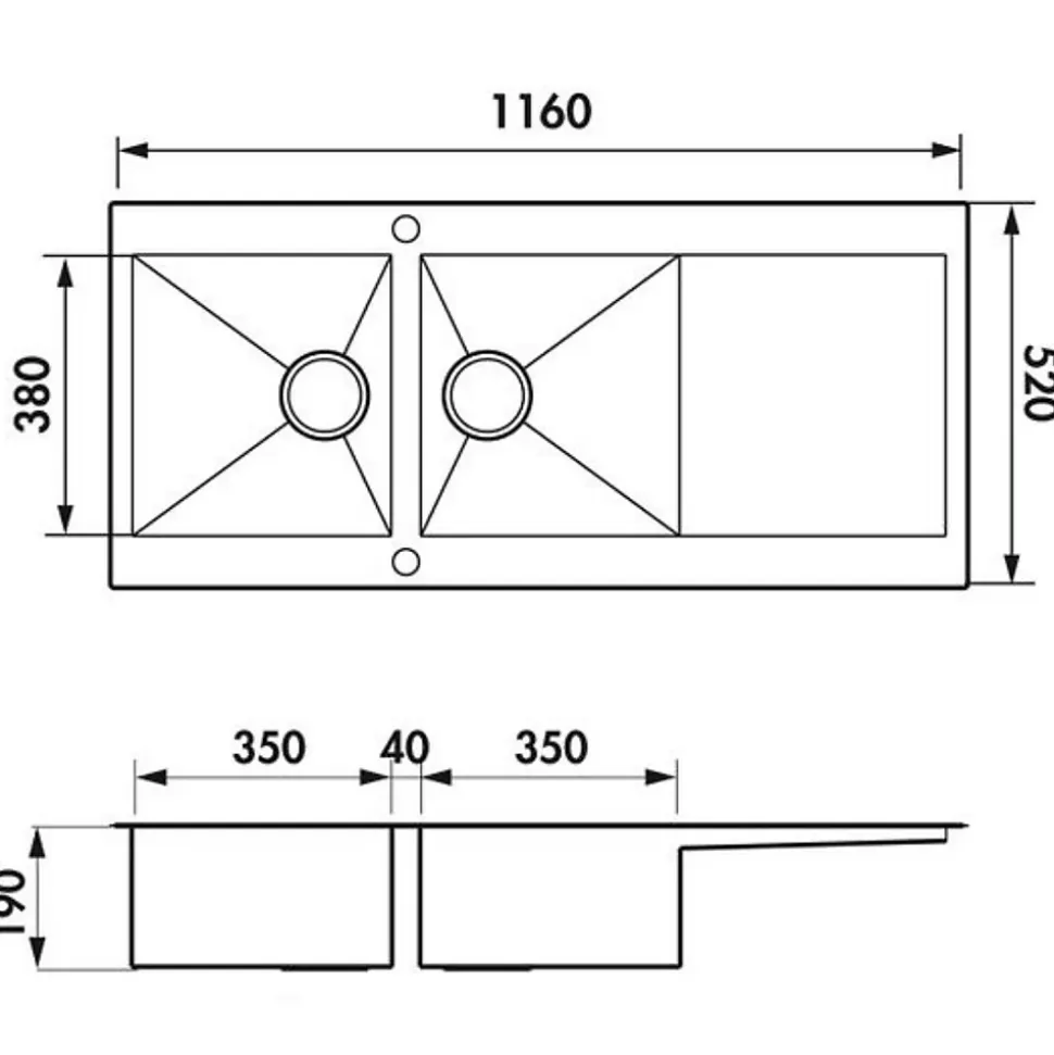 POINTS FORTS : • Évier encastrable 116×52 cm •• Meuble sous évier 80 cm minimum•• Evier vidage automatique •• Évier réversible CARACTÉRISTIQUES : • Équipements inclus : bonde(s), siphon, trop plein, tuyaux d’évacuation • Marque : sans marque • Matériau : Inox • Type de pose : à encastrer • Positionnement égouttoir : réversible • Coloris : Inox • Emplacement robinetterie : percé • Nombre de bacs : 2 bacs • Poids net (Kg) : 10.6 • Trop plein : oui • Sous-meuble : 80 cm • Longueur (mm) : 1160 • Largeur (mm) : 520 • Longueur d’encastrement (mm) : 1140 • Largeur d’encastrement (mm) : 500 • Grande dimension cuve 1 (mm) : 380 • Petite dimension cuve 1 (mm) : 350 • Profondeur cuve 1 (mm) : 190 • Diamètre bonde cuve 1 (mm) : 90 • Grande dimension cuve 2 (mm) : 380 • Petite dimension cuve 2 (mm) : 350 • Profondeur cuve 2 (mm) : 190 • Diamètre bonde cuve 2 (mm) : 90 • Bon à savoir : ce produit ne présente pas de spécificités supplémentaires • Vidage : automatique • Référence vidage : le vidage est déjà inclus
