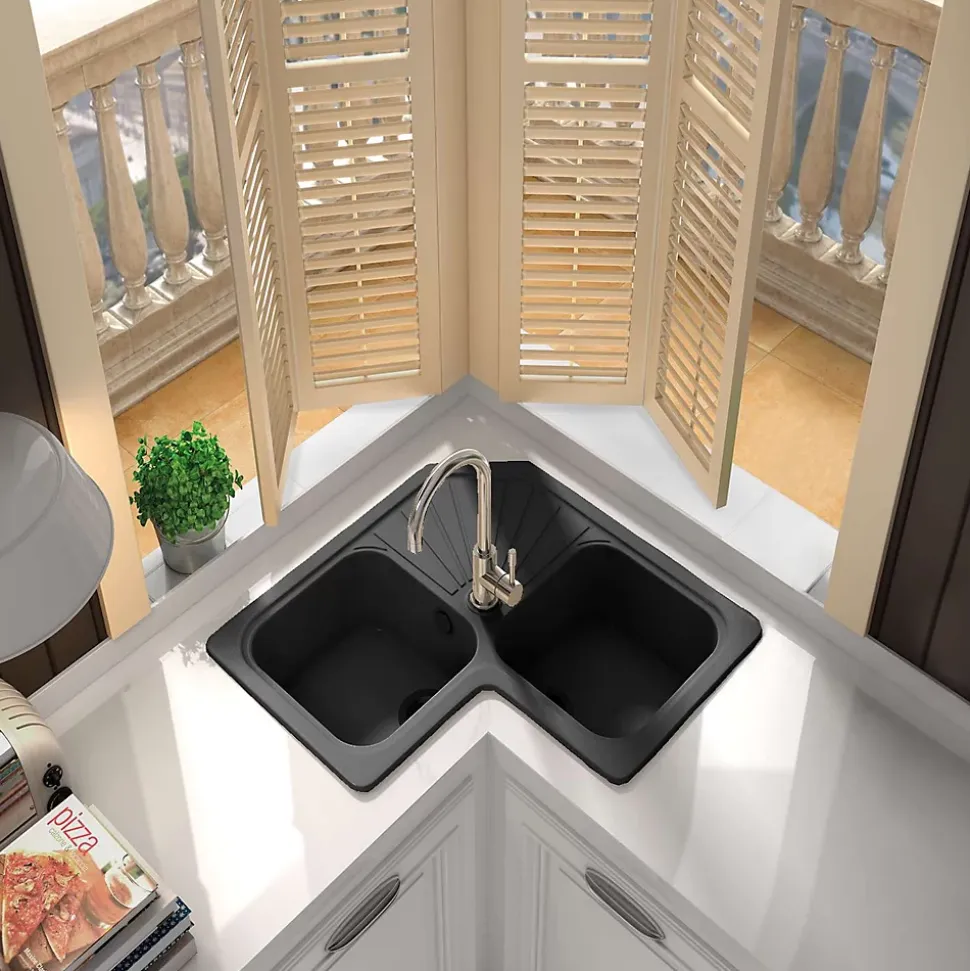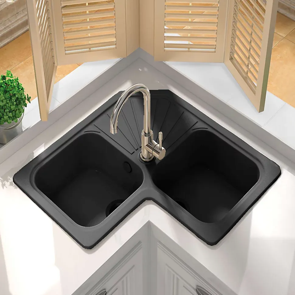 Evier pour meuble d’angle à encastrer Poalgi Agata Noir – 2 bacs avec égouttoir