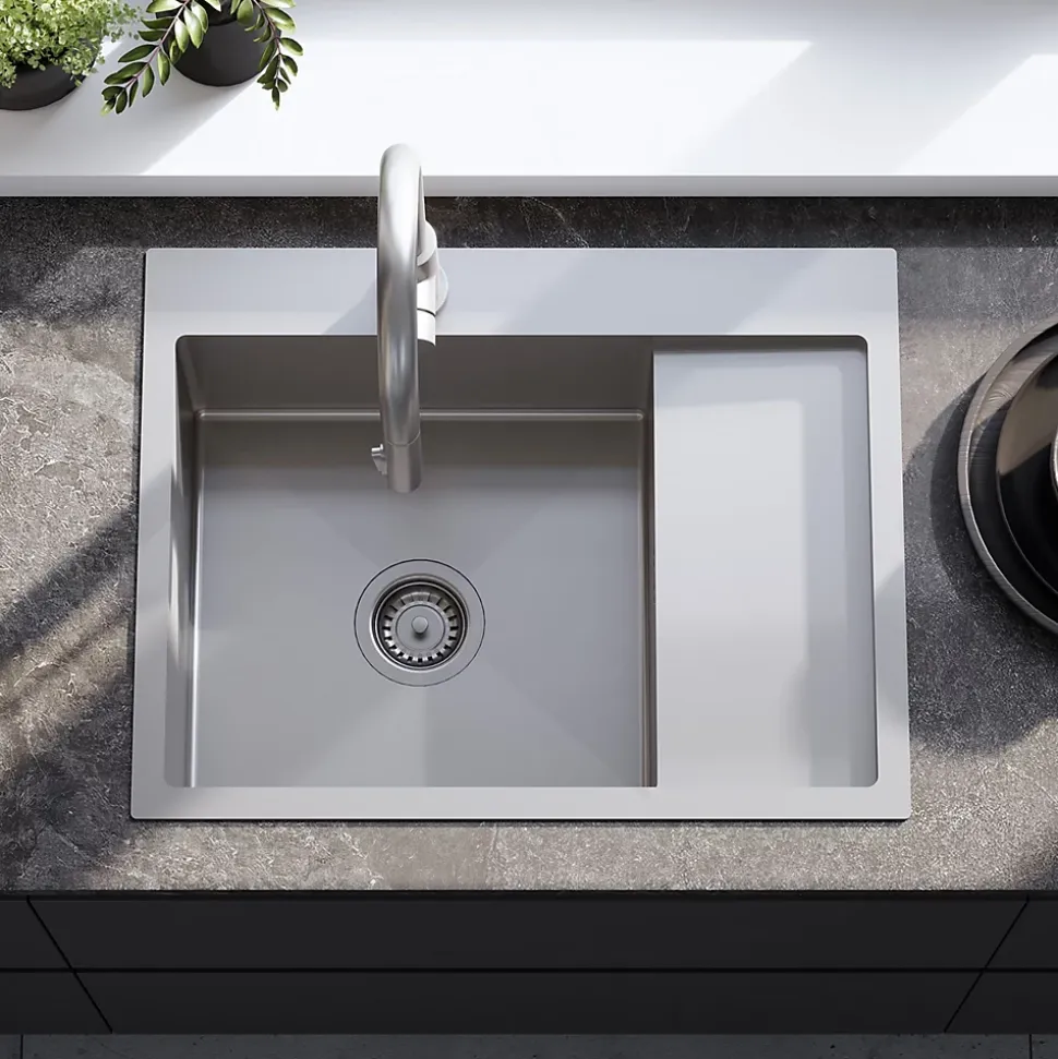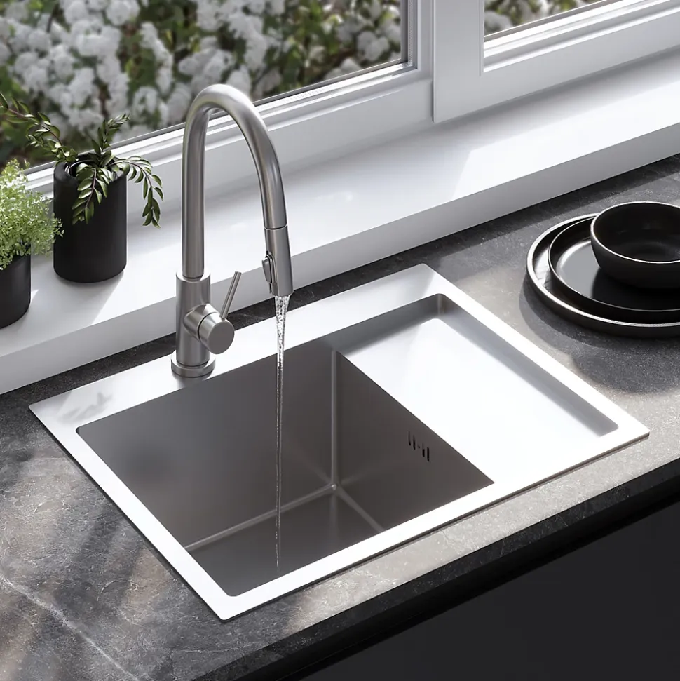 Avec son look minimaliste et moderne, l’évier de cuisine avec robinet mitigeur s’intégrera dans le design de n’importe quelle cuisine. Complété par un mitigeur à bec flexible, il crée un poste de travail complet dans la zone humide. Le produit est doté d’une bonde à la teinte assortie, ce qui confère à l’ensemble un aspect très cohérent et élégant. Le siphon, fourni avec l’évier, est un modèle pratique qui permet d’économiser de l’espace. Grâce à la disposition du tuyau d’évacuation, il est possible de créer un espace de rangement supplémentaire dans le placard sous l’évier pour les paquets de détergents ou les poubelles. Le matériau hygiénique et la facilité de nettoyage des surfaces lisses donnent à l’évier un aspect impeccable et empêchent la prolifération microbienne.
