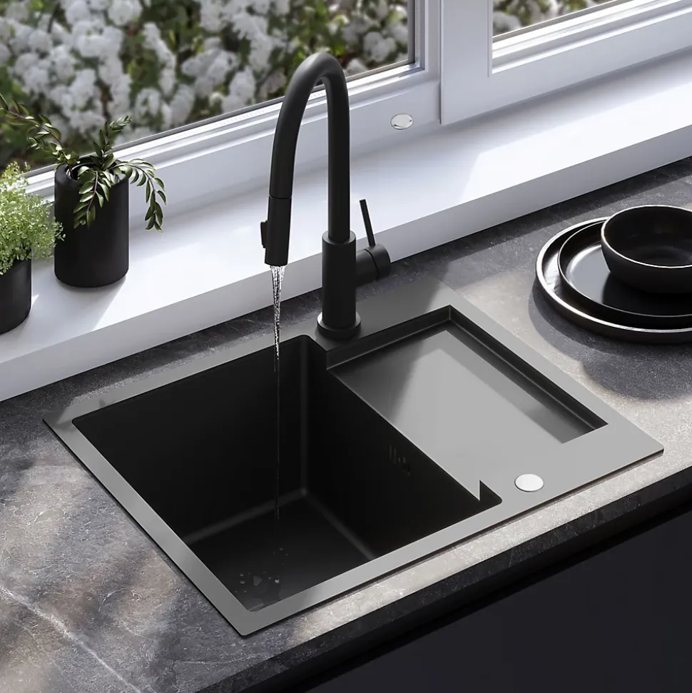 Avec son look minimaliste et moderne, l’évier de cuisine avec robinet mitigeur s’intégrera dans le design de n’importe quelle cuisine. Complété par un mitigeur à bec flexible, il crée un poste de travail complet dans la zone humide. Le produit est doté d’une bonde à la teinte assortie, ce qui confère à l’ensemble un aspect très cohérent et élégant. Le siphon, fourni avec l’évier, est un modèle pratique qui permet d’économiser de l’espace. Grâce à la disposition du tuyau d’évacuation, il est possible de créer un espace de rangement supplémentaire dans le placard sous l’évier pour les paquets de détergents ou les poubelles. Le matériau hygiénique et la facilité de nettoyage des surfaces lisses donnent à l’évier un aspect impeccable et empêchent la prolifération microbienne.